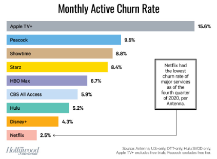 (좌) 고객획득률 그래프를 보면 넷플릭스의 구독자 수는 꾸준히 늘어났습니다. 그러나 고객을 계속 늘리는 것은 한계가 있습니다. 그리고 경쟁자들이 생기면서 시장은 포화되었습니다. (우) 고객이탈률 그래프는 넷플릭스와 경쟁자들의 고객이타률입니다. 넷플릭스의 이탈률이 가장 낮습니다.