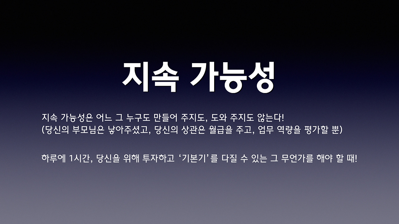 업무 현장의 직장 상사 또는 동료들이 가르쳐 주지 않는, 능동적이나 수동적으로 알려주지 않는 것에서 나올 수 없는 가르침을 본인 스스로의 시간 투입과 하루에 1시간 ~ 2시간 매일 쌓아하는 '축적의 시간'이야말로 '업무'를 함께 하는 것 이외에 기초 체력을 2배, 3배 그 이상의 효과로 반드시 이끌어 줄 것이라 믿습니다.