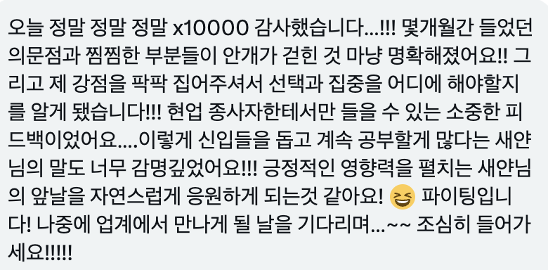 많은 디자이너들은 뛰어난 능력을 갖추고 있었고, 긴 취업 준비 기간과 반복된 좌절로 인해 자신에 대한 의구심이 생긴 것 같았다. 나 역시 비슷한 경험을 했기에, 이러한 고민은 성장 과정에서 자연스러운 것이라고 말을 건넸다.