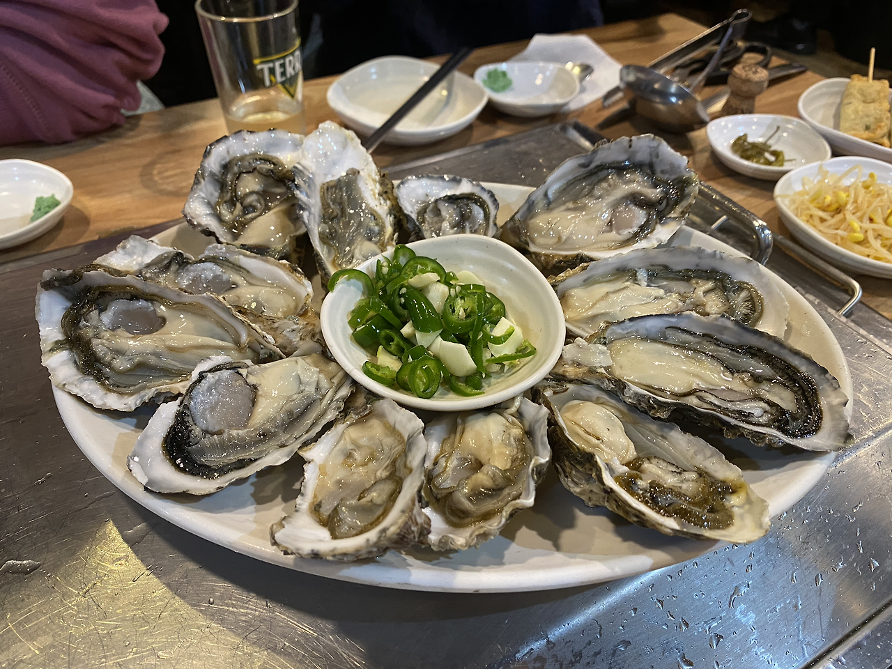 모란 근처에 가려던 식당은 만석에 동네 분위기가 흉흉했다. 선회해서 서울의 다른 조개찜 집으로 갔다. 거기도 사람이 줄을 설 만큼 북적북적했다. 삼사십 분을 기다린 끝에 주린 배를 움켜잡고 착석할 수 있었다. 기다림 끝에 먹는 석화와 부추전이 꿀맛 같았다.