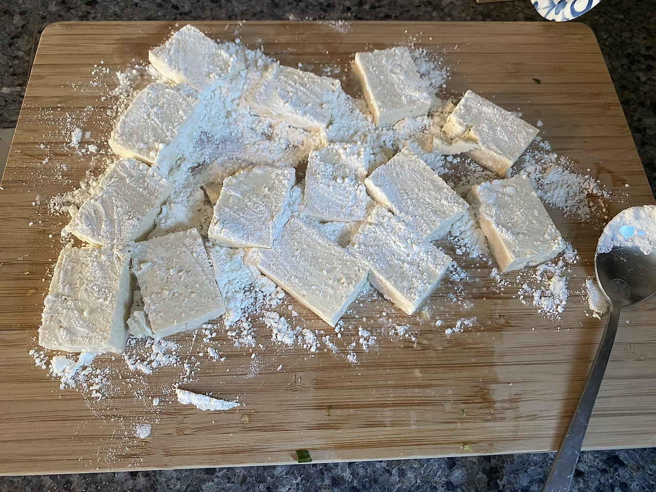 가장 유통기한이 최근이었던 밀가루를 까서 예쁘게 썰어 둔 두부 위로 솔솔 뿌려준다. 그리고 두부 몸통에 골고루 밀가루가 묻게끔 요리조리 뒤집어준다. 그럼 준비 완료다.