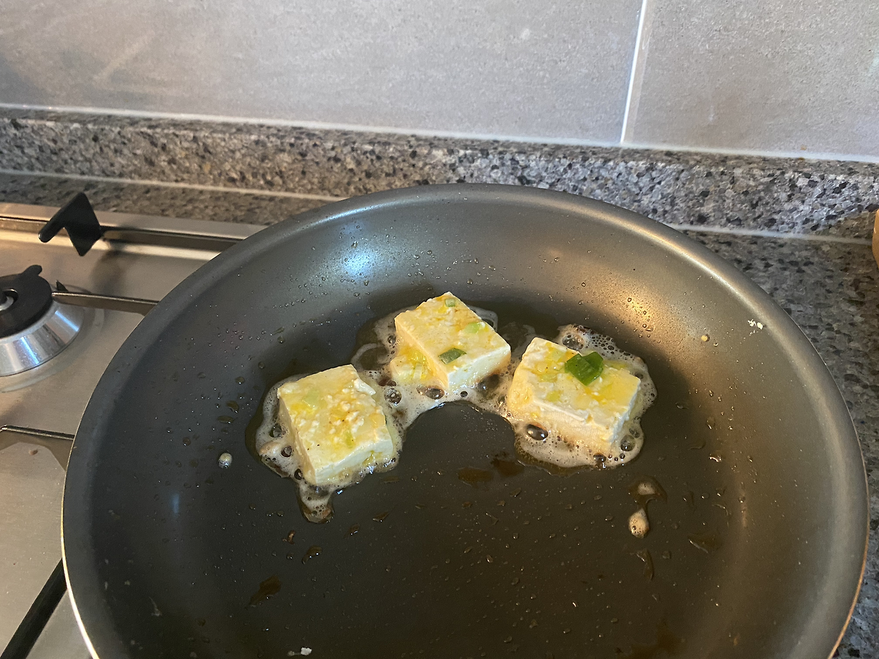 용감하게 두부 한 모를 탁 뜯어 뒤집은 후 도마에서 간격을 같게 썰어본다. 그리곤 달걀물을 만든다. 달걀 한 알을 넓은 접시에 깨어 넣고, 참치액 한 스푼, 다진 대파 한 스푼을 넣어 섞었다. 참치액은 달걀물의 감칠맛을 더해주나 바다향을 싫어한다면 소금과 맛소금으로 대체해도 되겠다. (요즘 '연두'라는 것도 인기가 많은 것 같던데 써보신 분 계시면 피드백 부탁드립니다.) 마지막으로 후추 한 번 톡톡하면 달걀물 완성이다.