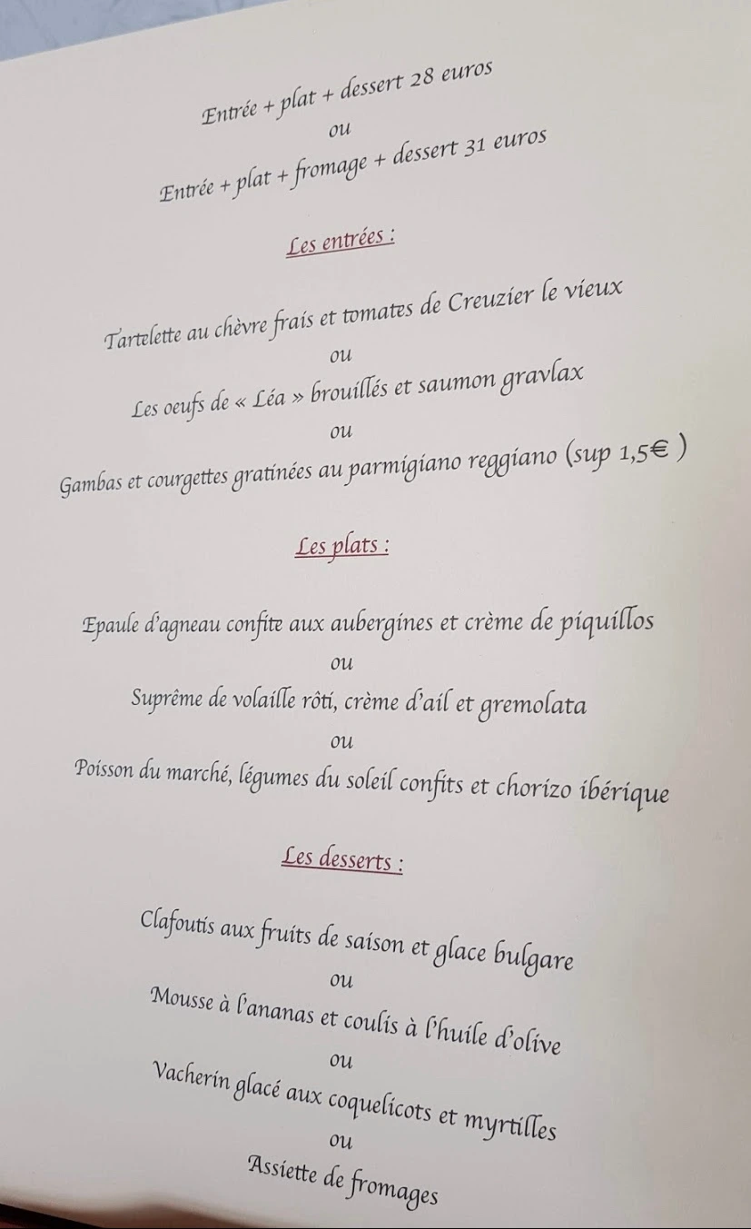 꼬불꼬불 풍성한 머리를 올려 묶은 그녀는 호리호리한 몸짓으로 나를 테이블로 안내해주었다. 깔끔하고 채광이 좋은 식당, 식탁보 없는 차가운 테이블, 약간 삐걱 소리 나는 나무 바닥, 선명한 빨간색의 냅킨, 요리 이름이 아닌 재료들의 조합으로 쓰여 있는 메뉴판. 이 모든 게 인상적인 분위기를 풍기고 있었다. 프랑스 VICHY의 식당, La Truffade의 첫인상이었다.