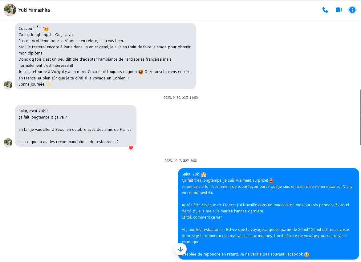 몇 주전, 열심히 VICHY 에세이 원고를 쓰고 있을 무렵, 당시의 정보를 찾기 위해 잘 들어가지 않는 페이스북에 로그인했다. 그런데 웬걸? 유키에게 연락이 와 있었다. 얼마 뒤에 한국여행을 갈 건데 맛집이나 괜찮은 카페를 알려줄 수 있냐는 메시지였다. 너무 반가워 잘 기억나지 않는 프랑스어를 떠올려가며 답장을 했다.