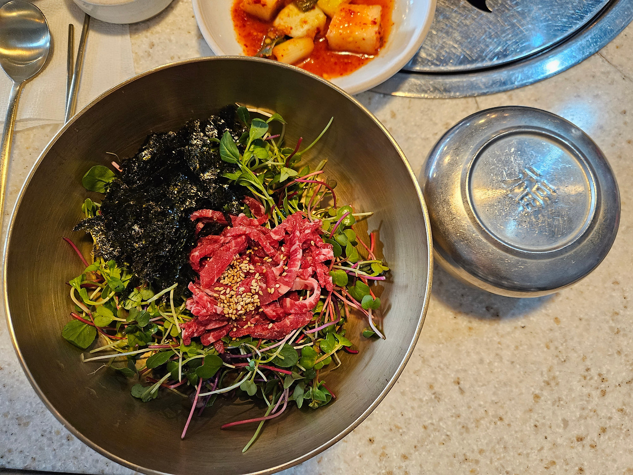 회사 주변에는 유독 육회비빔밥을 파는 가게가 많았다. 딱 봐도 회식하기에 좋은 고깃집에서는 점심메뉴로 육회비빔밥을 팔았고 청국장집과 일식집에서도 육회비빔밥을 팔았다. 내가 처음 먹어봤던 육회는 어느 바에서 안주로 먹었던 육회 타르타르였다. 의심반 호기심반으로 아주 조금 맛을 봤는데 생각보다 훨씬 맛있었다. 그날 이후로 육회는 내가 먹을 수 있는 음식 목록에 올라갔고 그 덕분에 회사 주변에서 점심을 먹을 때도 당당하게 육회비빔밥을 주문했다. 새싹채소, 김, 육회에 밥과 고추장만 넣고 비볐을 뿐인데 이렇게나 맛있다니! 육회비빔밥의 매콤한 맛에 스트레스가 풀렸고, 육회의 식감은 흥미로웠으며, 비빔밥 그 자체로 든든했다.