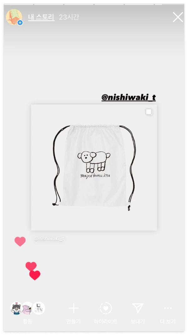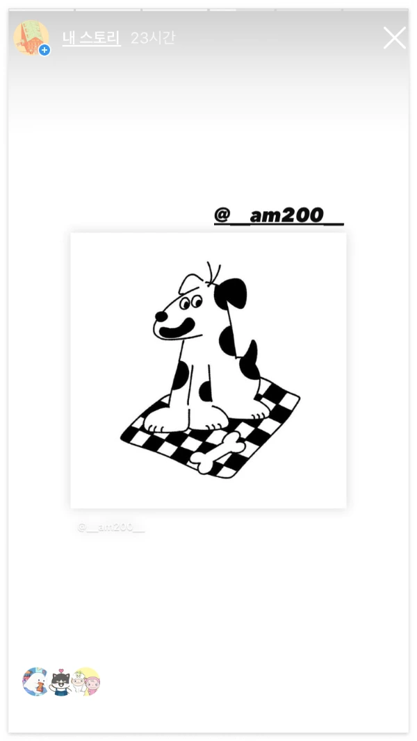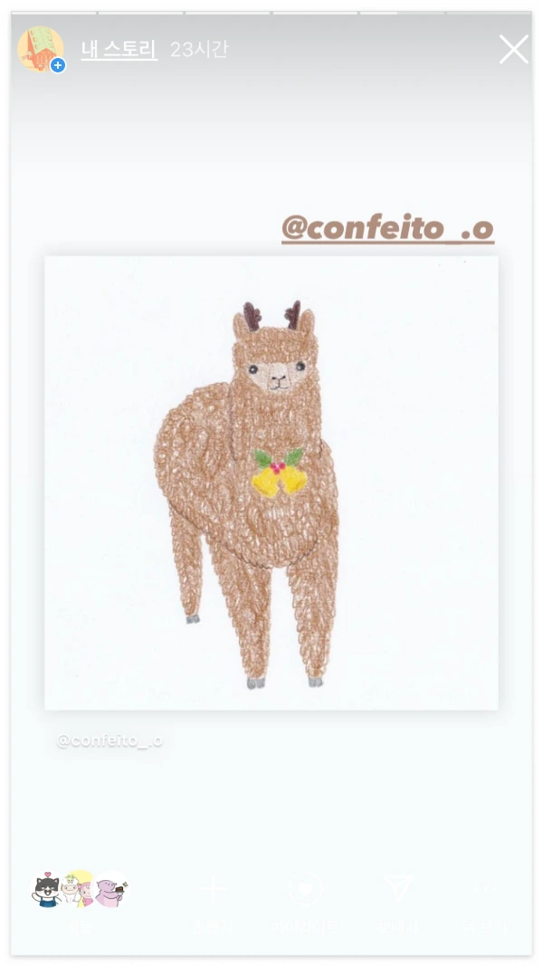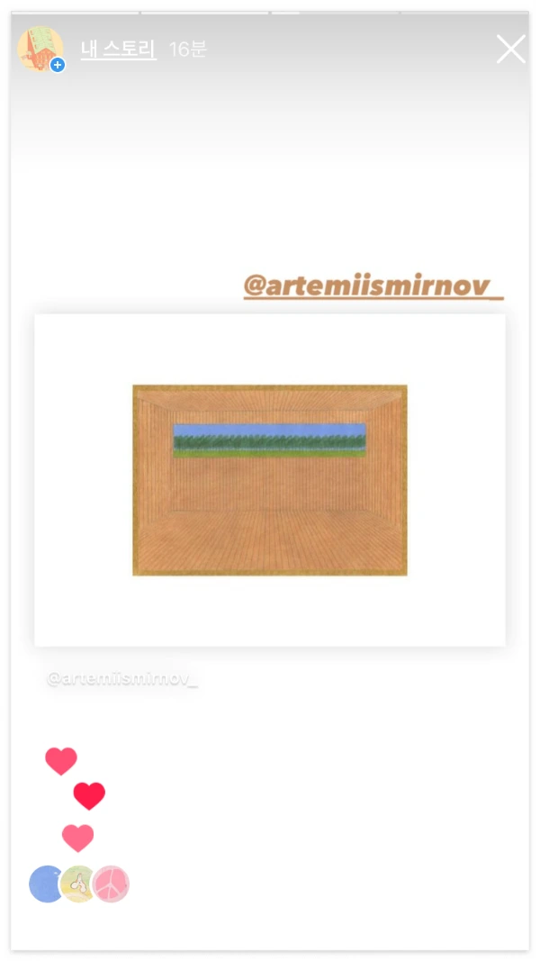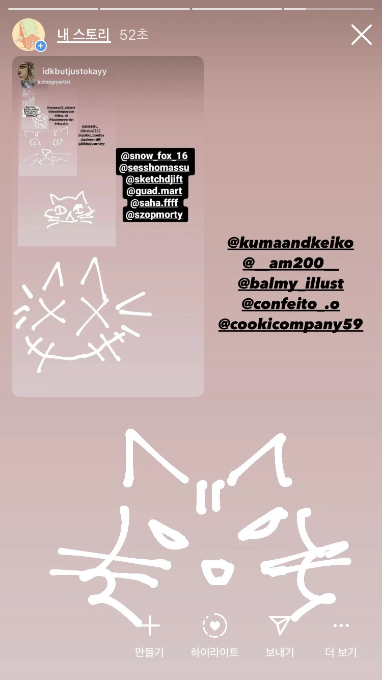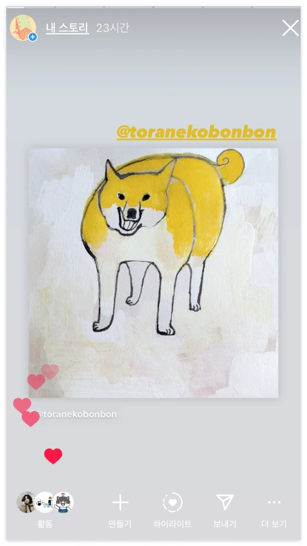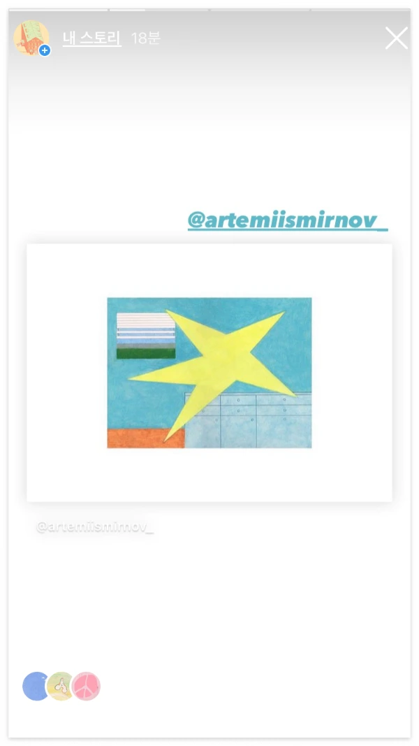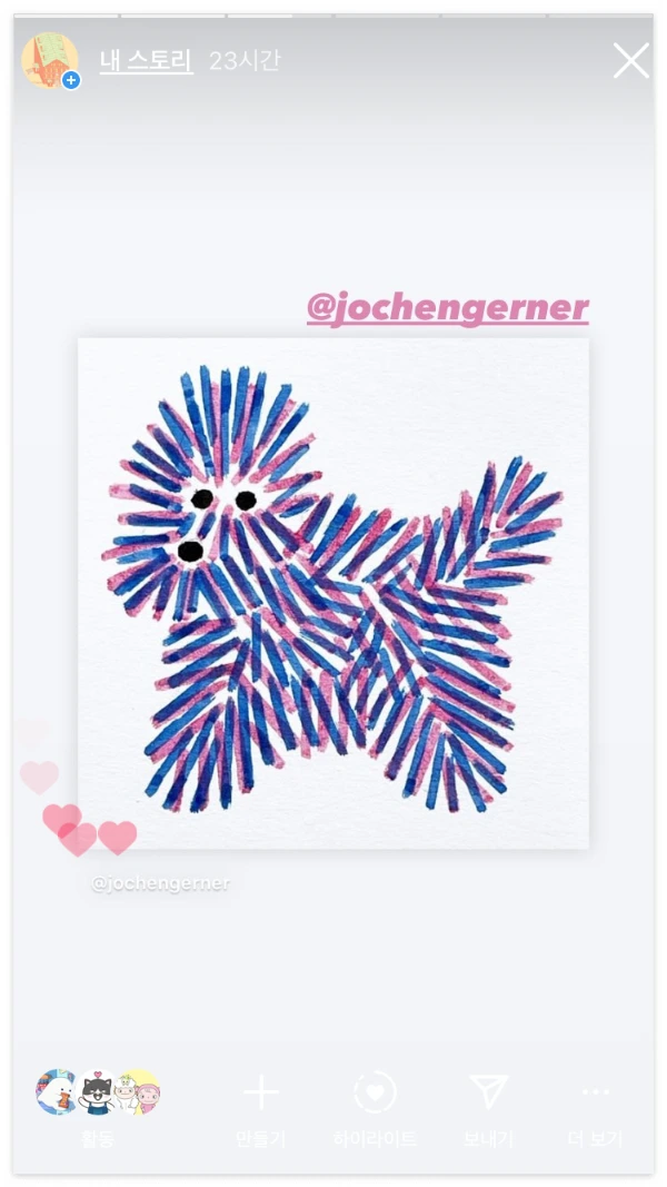 다른 작가의 게시물(그림)을 큐레이션 하는 것은 내가 스토리로 가장 많이 사용하는 방식이다. 내가 팔로우하고 있는 작가들 중 다른 사람들에게 소개하고 싶은 그림들(+작가계정 태그)을 모아서 내 스토리로 공유하고 있다.