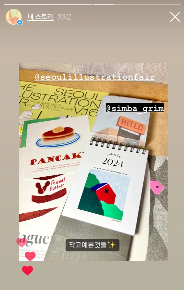 일러스트와 관련된 오프라인 활동들도 스토리로 공유하려고 노력하는 중이다. 최근에는 서일페(서울일러스트페어)Vol.16에서 구매한 굿즈들을 공유하기도 하고, 일러스트 숨은그림찾기 앱 '숩숩' 화면을 공유하기도 했다. 나의 경우엔 오프라인에서 하는 사소한 일은 거의 공유하지 않고 있지만, 서일페와 숩숩에 내가 팔로잉하고 있는 작가님들이 참여한지라 인스타 스토리로 후기를 공유하는 게 꽤 의미 있는 일이 되었다.