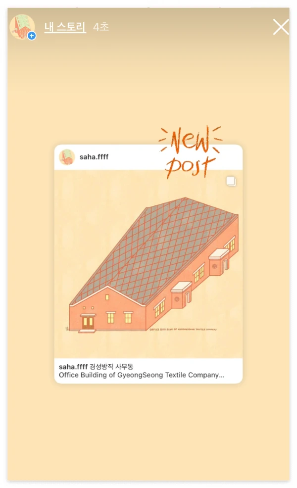 인스타 그림계정에서 스토리로 가장 많이 공유되는 것은 아마도 '새로운 게시물 알림'일 것이다. 새로운 그림을 올릴 때마다 스토리로 "New Post" 알림을 띄운다. 나를 팔로우하는 사람들은 스토리를 보고 새로운 게시물을 보러 오고, 팔로우하지 않는 사람들도 지나가다 스토리를 보고 내 계정에 방문하기도 한다.