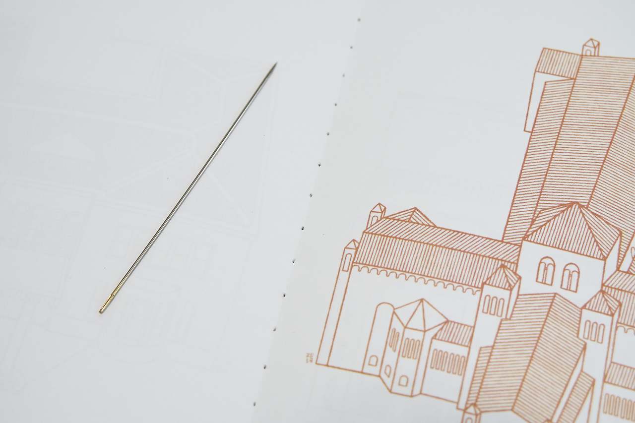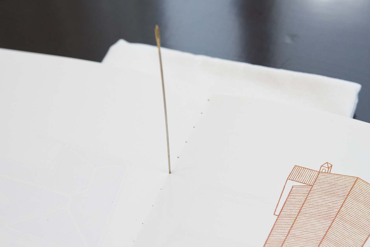 도안들을 잘 겹쳐준 후, 실제본을 하기 위한 구멍을 뚫어줘야 한다. 간격은 설정하기 나름이지만 1.5cm 정도가 적당하고 예쁜 것 같다(아래 사진은 1cm 간격). 자와 연필로 구멍을 표시한 후, 바늘로 구멍을 숭숭 뚫어준다. 바닥이 딱딱하면 바늘이 들어가지 않기 때문에 종이 아래 손수건이나 천을 받친 후 진행한다.