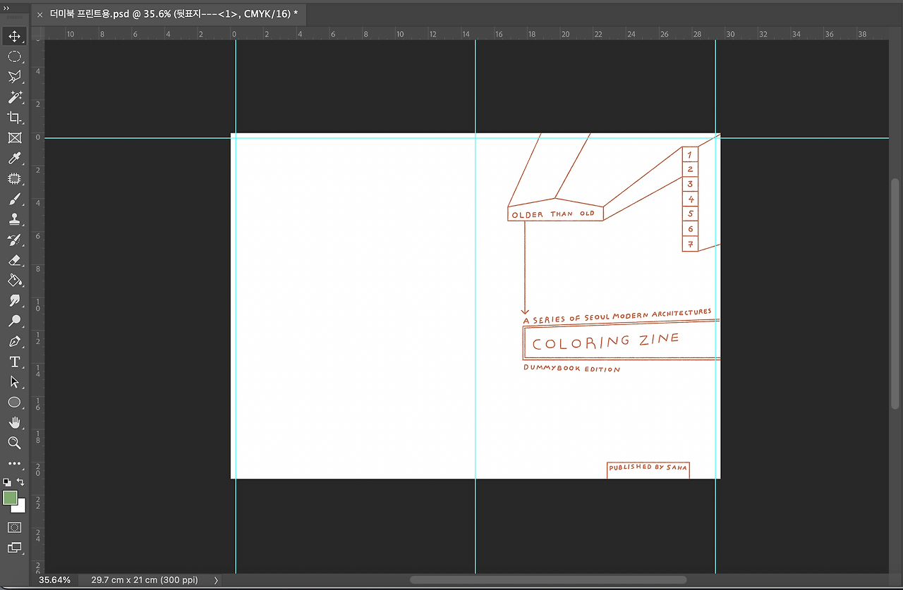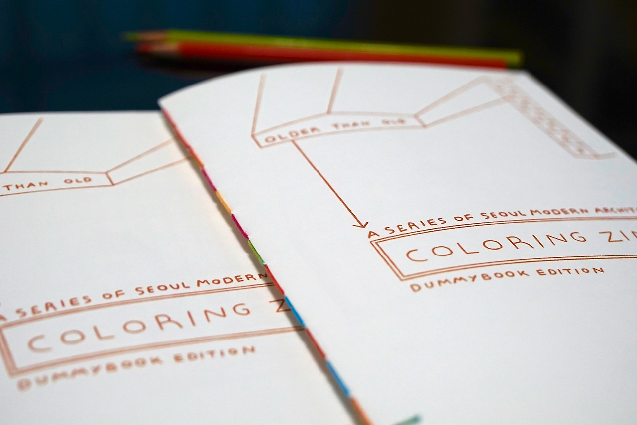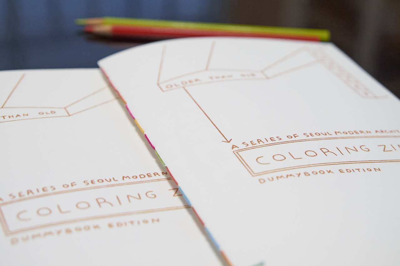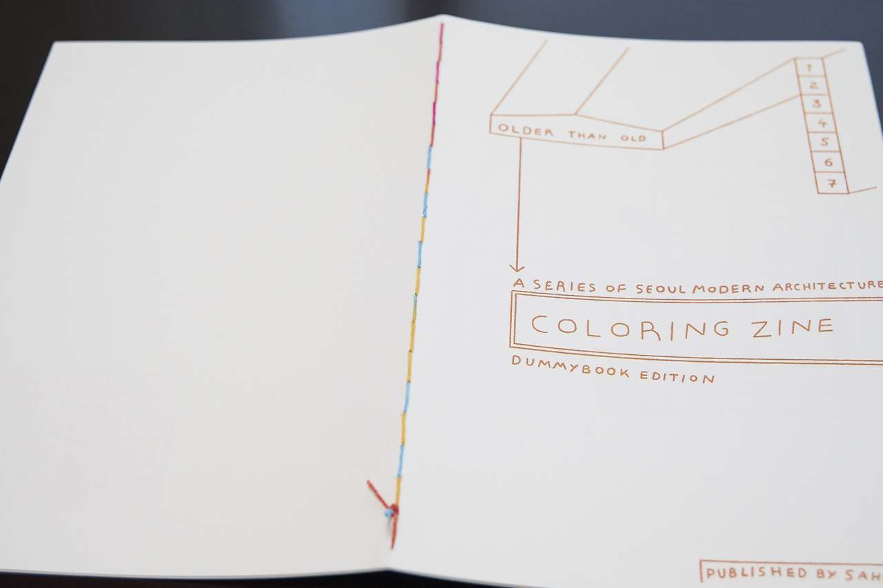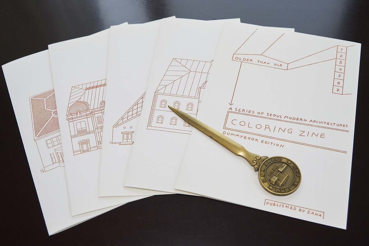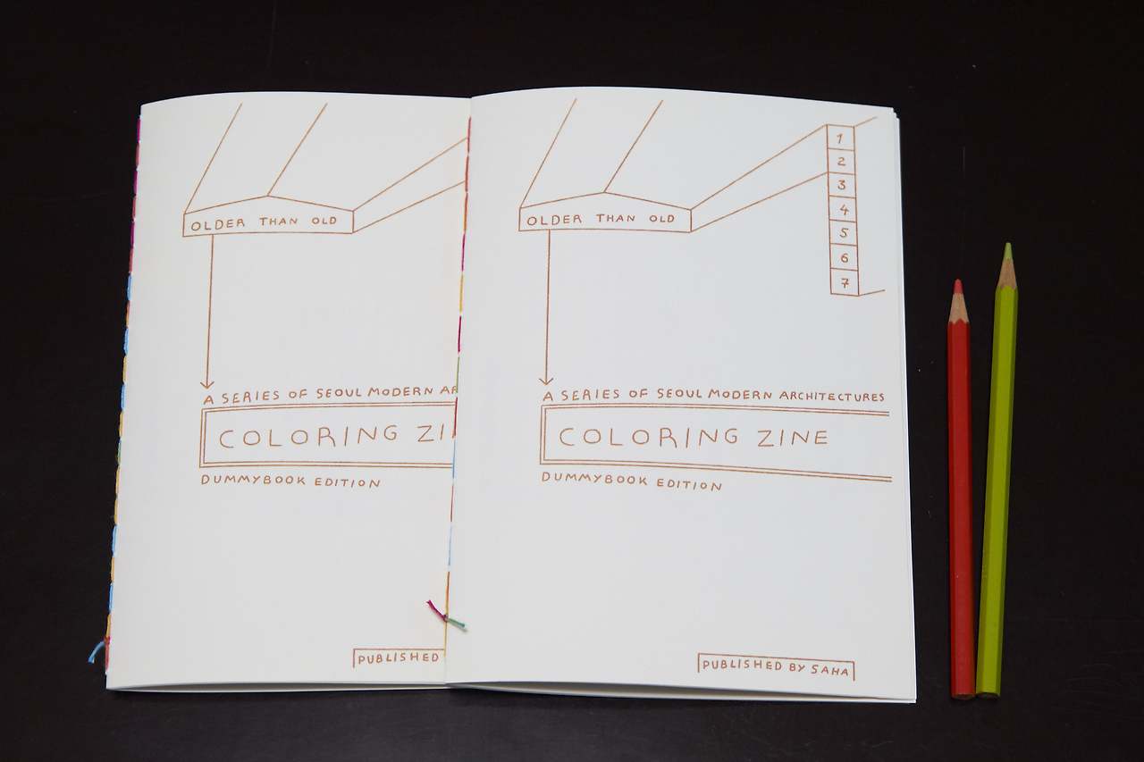 컬러링북의 사이즈, 페이지, 도안종류, 기타 정보, 종이 등을 정하는 작업이 필요하다. 나는 직접 그린 근대건축물 시리즈 <Older Than Old> 중 7개의 도안을 선택했다. 사이즈는 A4를 반 접은 A5 판형으로, 종이는 미색 용지로 계획했고, 발행정보도 깨알같이 넣어주기로 했다.