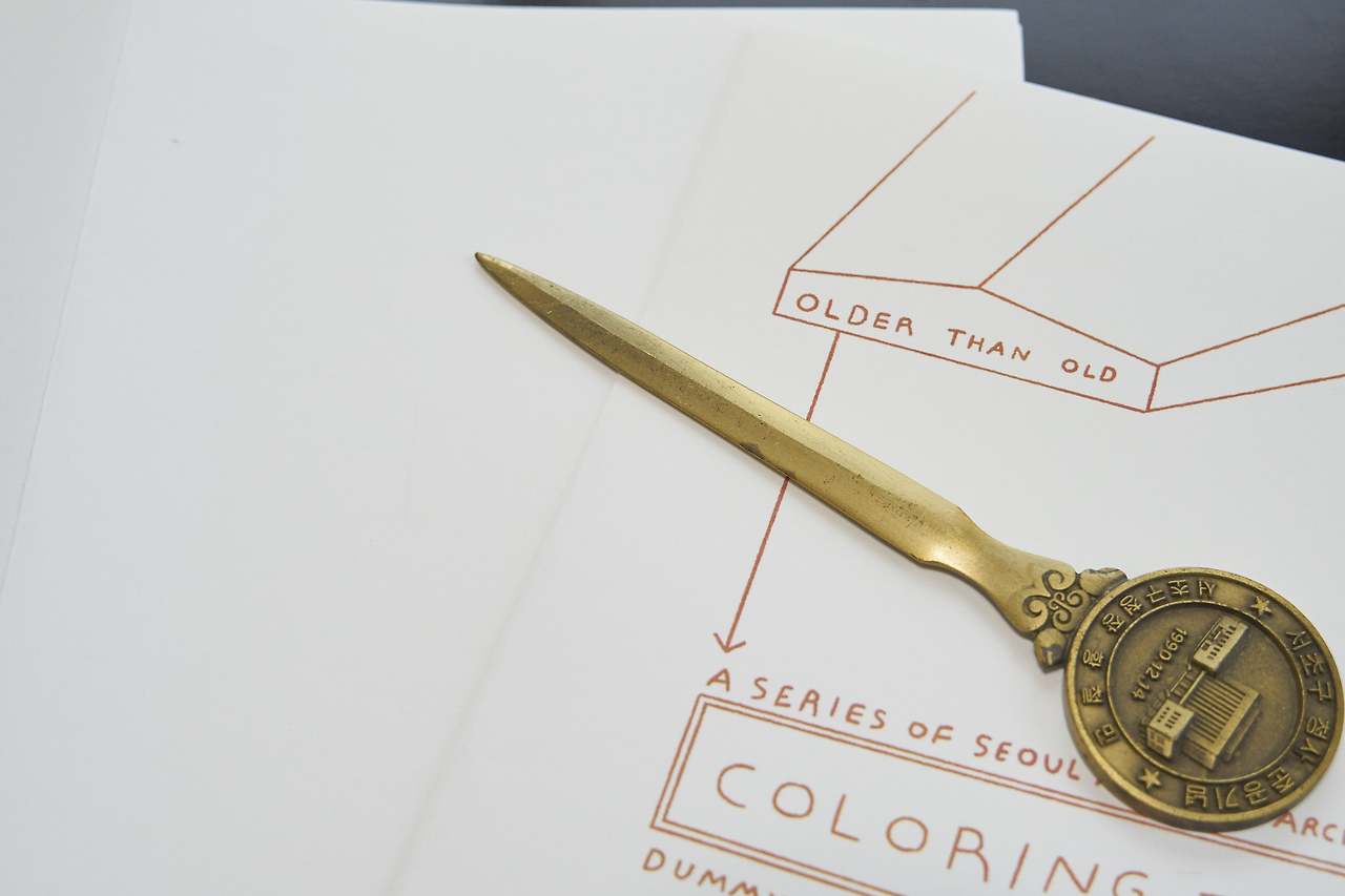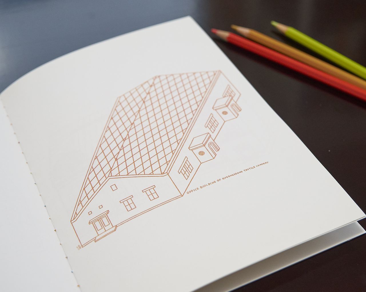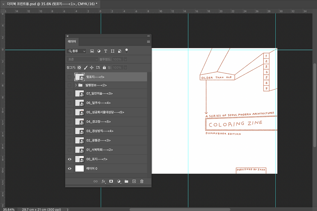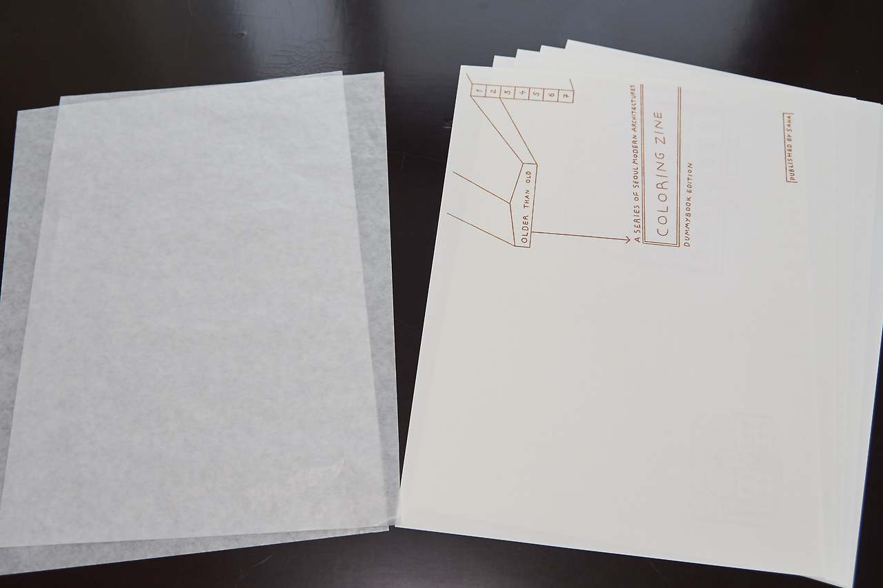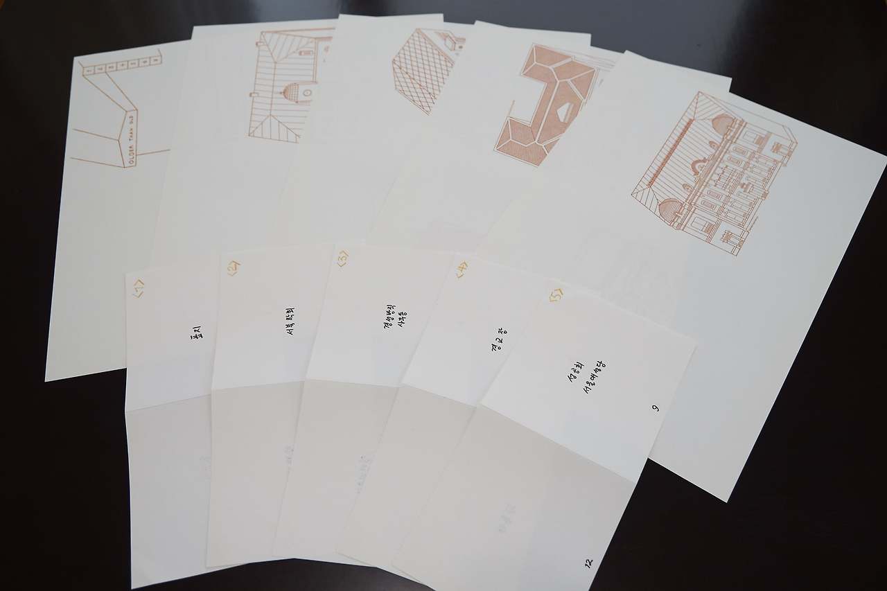 컬러링북의 사이즈, 페이지, 도안종류, 기타 정보, 종이 등을 정하는 작업이 필요하다. 나는 직접 그린 근대건축물 시리즈 <Older Than Old> 중 7개의 도안을 선택했다. 사이즈는 A4를 반 접은 A5 판형으로, 종이는 미색 용지로 계획했고, 발행정보도 깨알같이 넣어주기로 했다.
