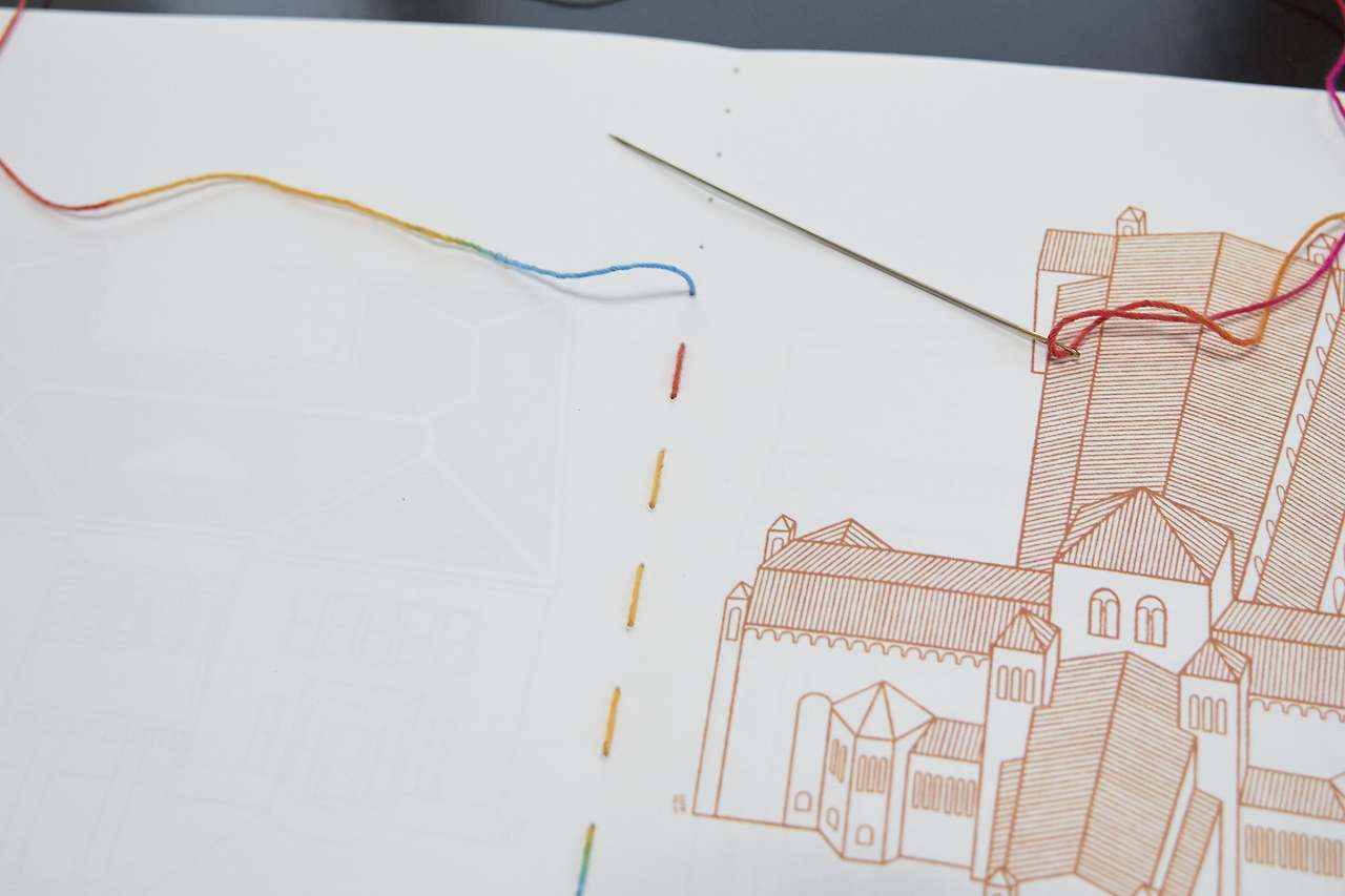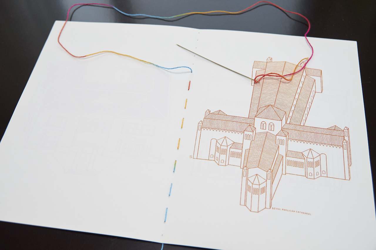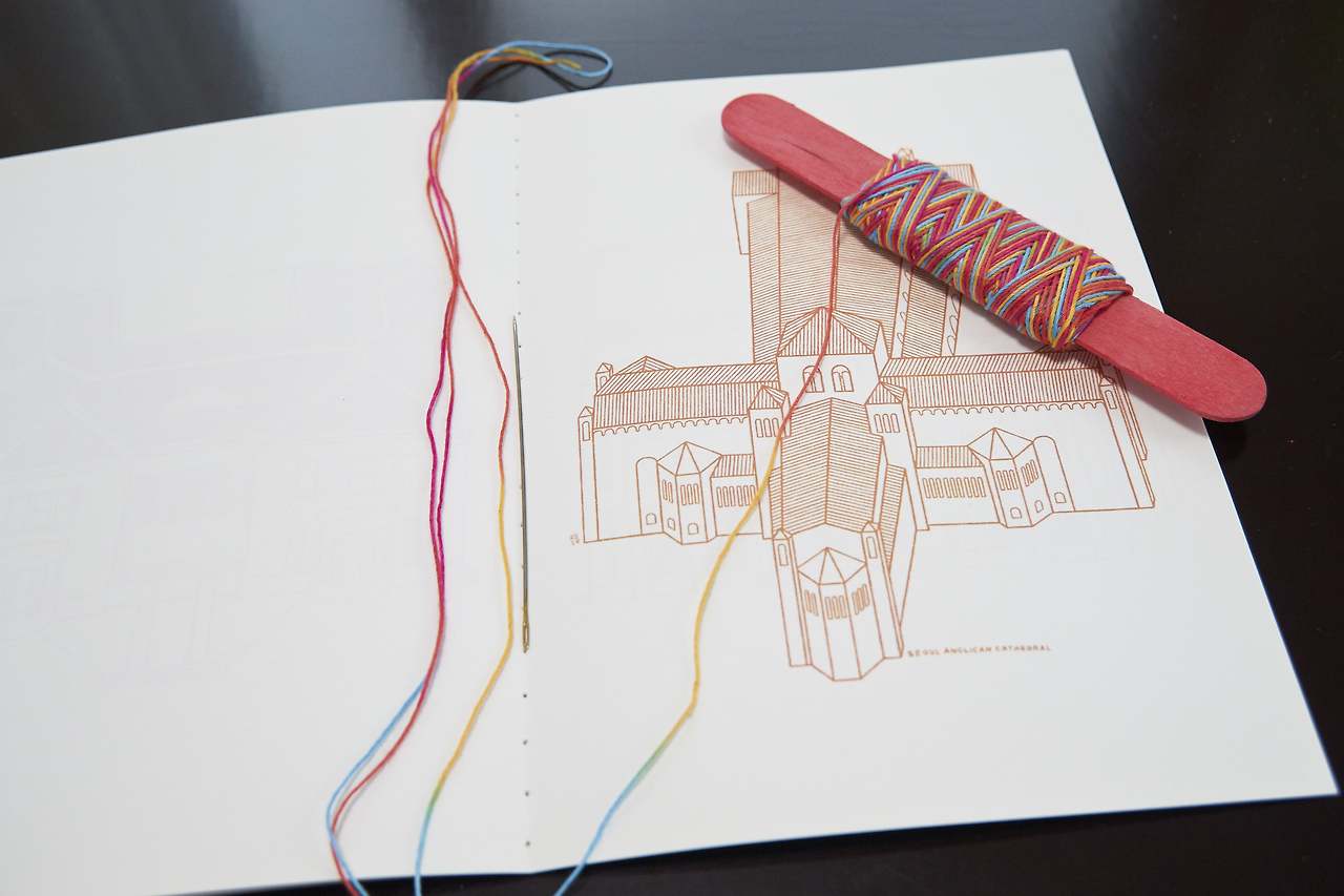 구멍을 다 뚫었으면 아래서 두 번째 구멍(바깥에서 안쪽으로)부터 시작해서 안팎을 교차하며 바느질을 해주고, 시작점으로 돌아와 매듭을 단단히 짓는다. 컬러풀한 색실로 엮으니 컬러링북의 느낌이 한층 화사해졌다.