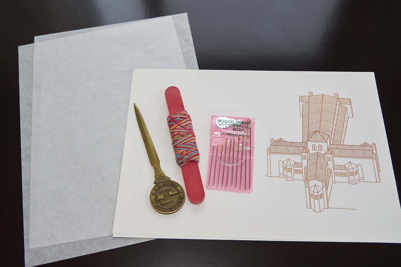 프린트한 도안들, 두꺼운 바늘, 두꺼운 실, 레터오프너, 손수건, 자, 연필