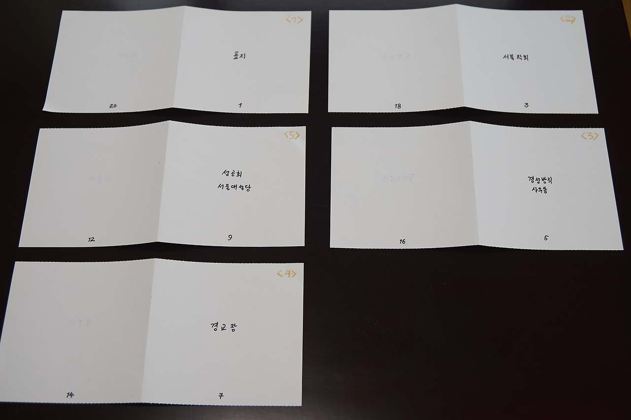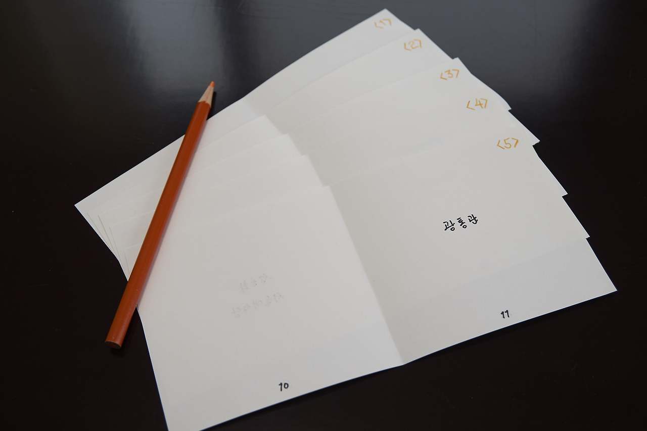 모형북은 아주아주 중요하다. 모형북을 만들어 두면 헷갈리지 않고 작업할 수 있다. 연습장을 대충 잘라서 페이지별로 들어갈 그림 정보를 기재한다. 표지와 7개의 도안, 발행정보를 담기 위해서는 총 20페이지가 필요했다. 그리고 20페이지의 A5판형 컬러링북을 만들기 위해서는 총 5장의 A4용지가 필요하다. 따라서 모형북도 5장만 있으면 된다. 프린트할 때 헷갈리지 않도록 [종이번호(1-5)], [페이지번호(1-20p)], [도안이름]을 모형북에 적어준다. 뒤비침을 방지하기 위해 도안은 오른편에만 인쇄하기로 해서 왼편은 비어있게 될 예정이다.