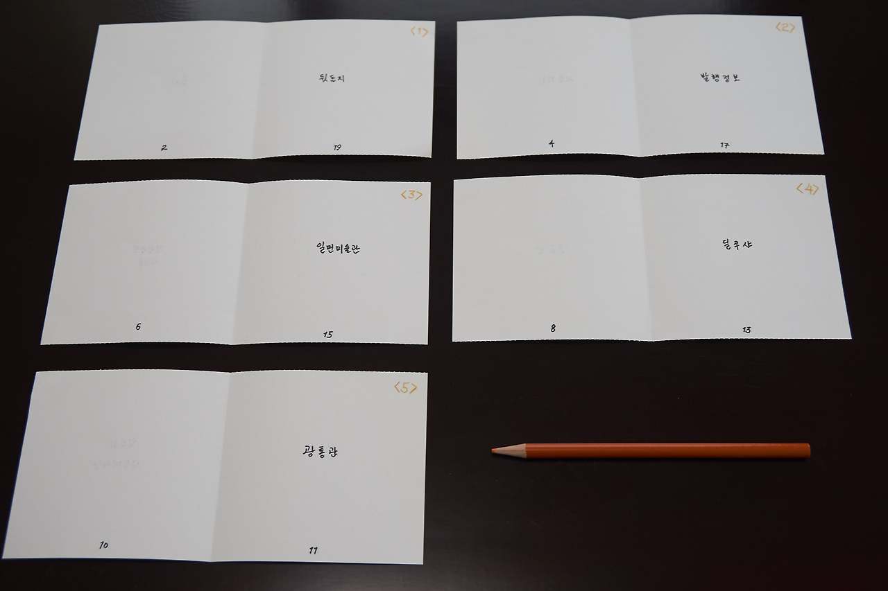 프린트한 도안을 한 장씩 반으로 접어서 미리 정해놓은 순서대로 겹쳐준다. 이때, 양끝 모서리를 잘 맞춰서 살짝 접은 후에 레터오프너로 슥슥 야무지게 밀어준다. 레터오프너가 없다면 커터칼 밑면 같은 날렵하고 묵직한 물건을 이용해도 된다. 도구 없이 접으면 자잘한 주름이 생겨 안 예쁠 수 있다.