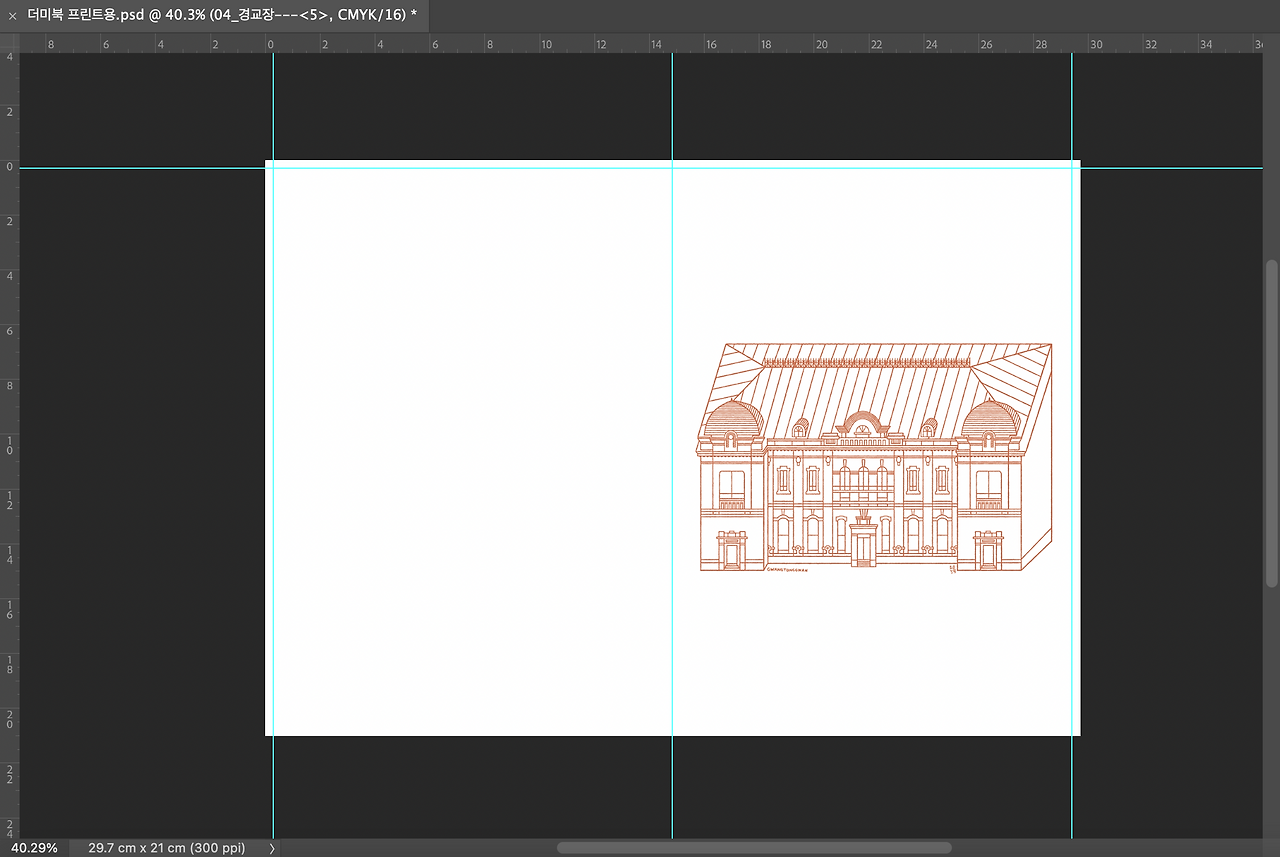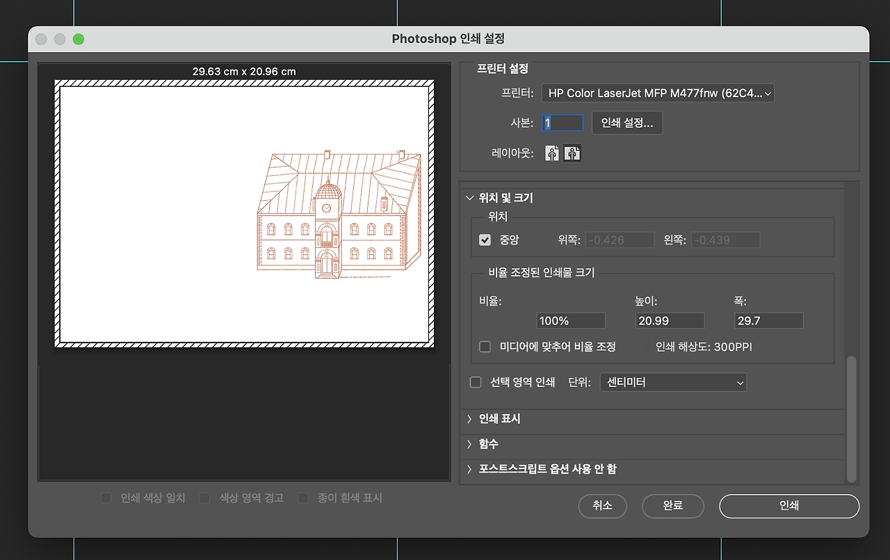 드디어 도안을 프린트할 차례이다. 이 과정이 가장 헷갈리므로 미리 만들어 둔 모형북을 보며 [종이번호]를 기준으로 차근차근 프린트한다. 나의 컬러링북은 총 20페이지이기 때문에 총 5장의 종이 앞뒷면을 번갈아가며 인쇄했다. 참고로, 포토샵으로 작업했을 경우에 도안이 잘릴까 걱정된다면 프린트 설정에서 '미디어에 맞춰 비율조정'을 체크하면 된다.
