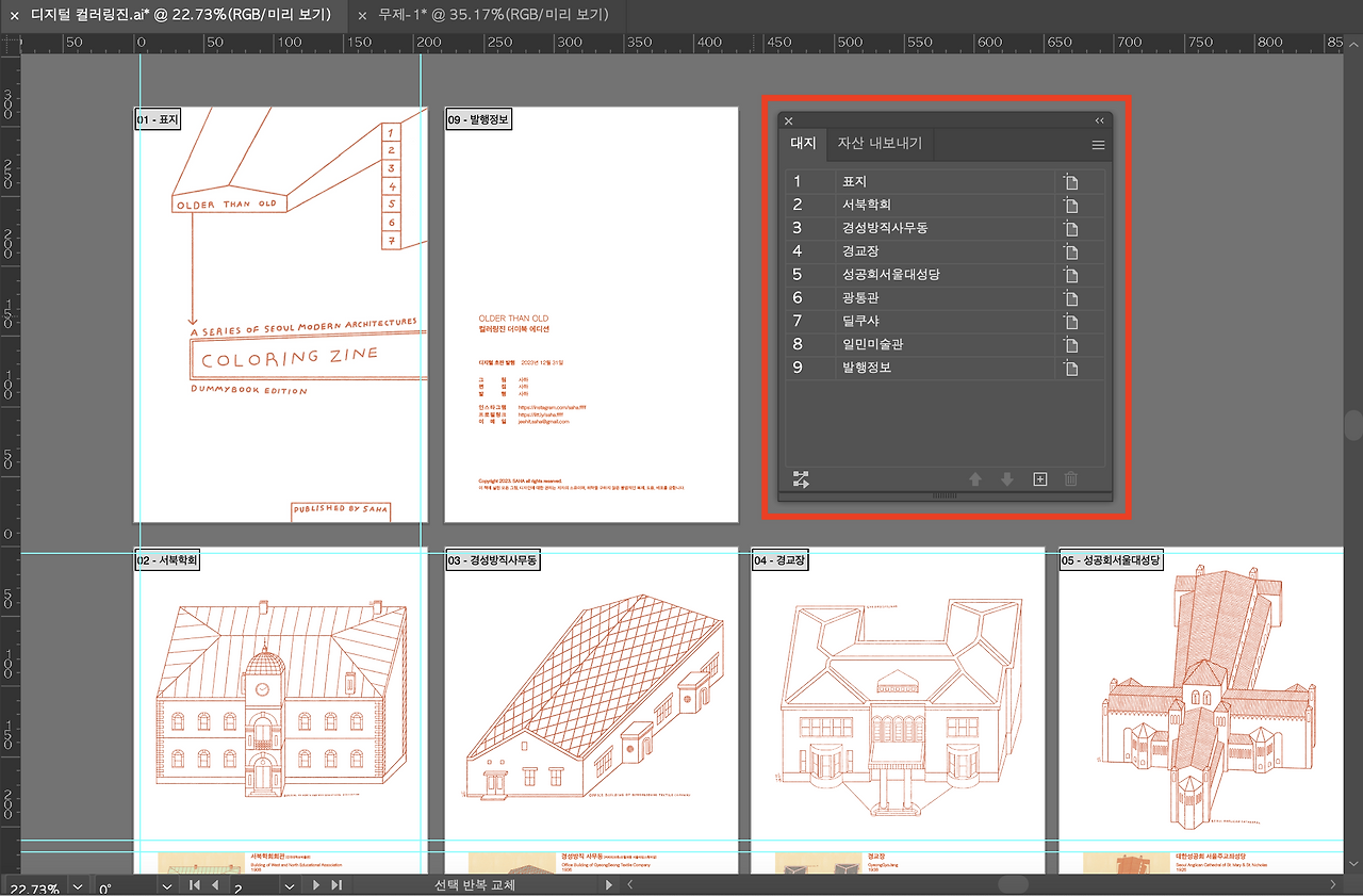 표지[1] + 도안[7] + 발행정보[1] = 총 9장의 대지를 만들어주었다.