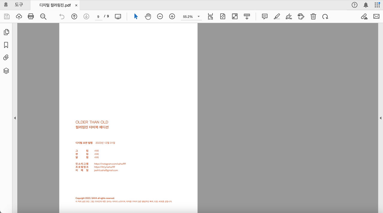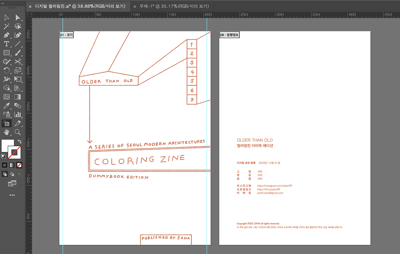 나는 A4 규격에 맞춰 미리 만들어 놓은 표지가 있어서 그대로 이미지를 불러와서 표지를 완성했다. 발행 정보에는 [제목/발행일/발행인/이메일/저작권] 등의 정보를 넣어준다. 디지털 파일은 유포가 굉장히 쉬워 악용될 수 있기에 최소한의 저작권 문구는 꼭 넣어주어야 한다. 특히, 판매용으로 제작할 경우에는 필수적이다.