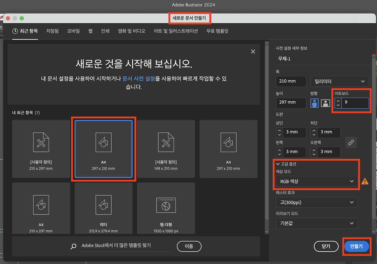 (4) 고급옵션 > 색상모드 : RGB (디지털용은 RGB, 인쇄용은 CMYK가 적절)