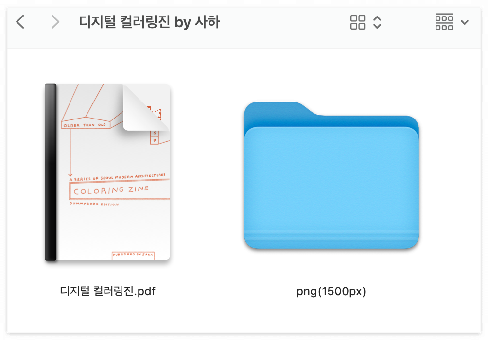PDF와 PNG 모든 파일이 준비되었다면, 파일들을 하나의 폴더에 담아준다. 최종 폴더에는 아래와 같이 디지털 컬러링북 [pdf] 파일 1개와 [png] 컬러링 시트 8개를 모은 폴더 1개가 포함되었다. [jpg] 컬러링 파일도 준비했다면 해당 폴더 하나를 더 추가시키면 된다.