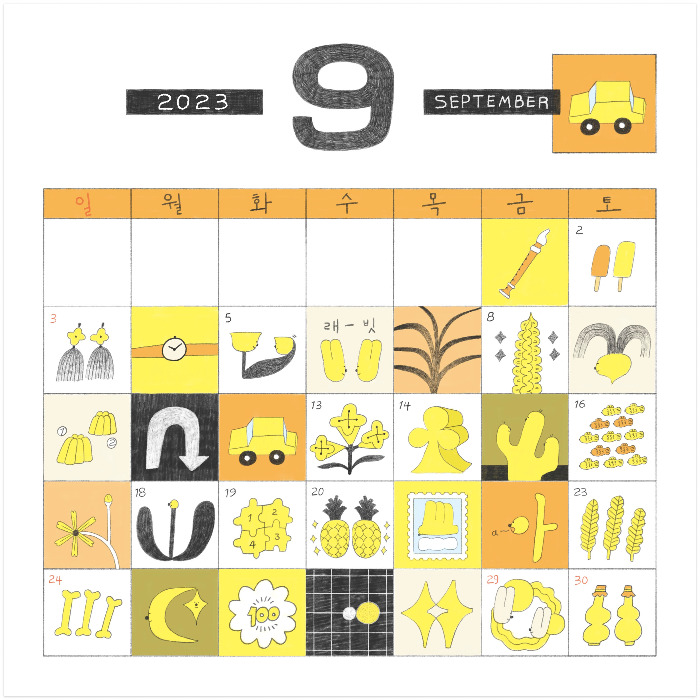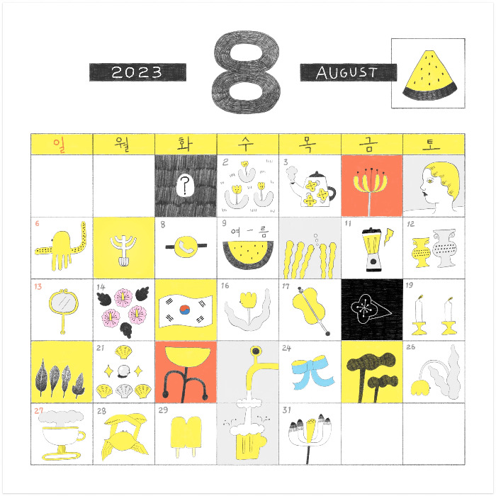 SNS 상에서 1일 1그림과 같은 챌린지 콘텐츠는 인기가 많다. 연필선으로 직접 그린 달력에 하루에 한 칸, 그리고 싶은 것은 그 무엇이든 그려 넣는 작업을 시작했다. 그날의 기억이 될 수도 있고, 스쳐 지나간 사물이 될 수도 있고, 그저 귀여운 것이 될 수도 있다. 하루 한 칸 소소한 것으로 채우는 그림달력인 것이다. 솔직히 말하면 하루에 하나씩 귀여운 걸 그리고 싶어서 시작했다. 일주일 동안 그린 것을 매주 1회 올렸고, 캐릭터보다 인기가 좋았다. 중간에 한 달 인스타그램 공백기가 생기면서 중단했지만 곧 다시 작업을 이어가고 싶은 애정 어린 콘텐츠다.