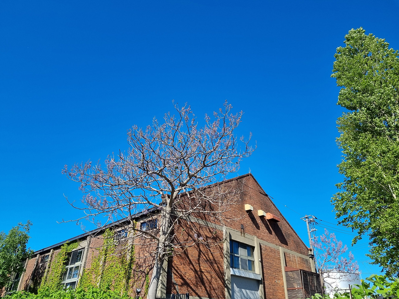 파란 하늘 아래 빨간 건물과 주변의 초록잎들, 그와 대비되는 앙상한 가지만 있는 나무