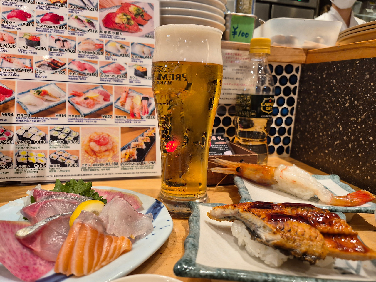 평소 날 음식은 즐기지 않는 터라 딱히 스시가 ‘먹고 싶어 죽겠어’는 아닌데 일본에 왔으니 '한 번은 먹어야지!' 하고 방문하는 곳이다. 예약까지 해가며 방문하는 비싼 오마카세를 날 생선의 맛도 제대로 못 느끼는 내가 굳이 비싼 돈 주고 방문하기보단 합리적인 가격에 다양하게 즐길 수 있어 좋다. 물론 주로 먹게 되는 건 매번 먹는 광어와 참치, 장어, 새우 초밥이다. 늘 주서는 곳이라 회전율이 높아 식사재는 비린 맛없이 신선하지만 그만큼 맥주잔 회전율도 높아 냉장고에서 칠링 할 시간이 없어 살얼음 동동 맥주잔은 기대할 수 없다. 그럼에도 이곳 장어와 참치대뱃살은 입안에서 살살 녹아 위안이 된다. 한 접시에 1종 2피스가 제공되는 스시가 부담스럽다면 한 접시에 같은 재료로 다양하게 조리된 3가지 종류의 초밥을 맛볼 수 있어 혼자 먹기 편한 곳!