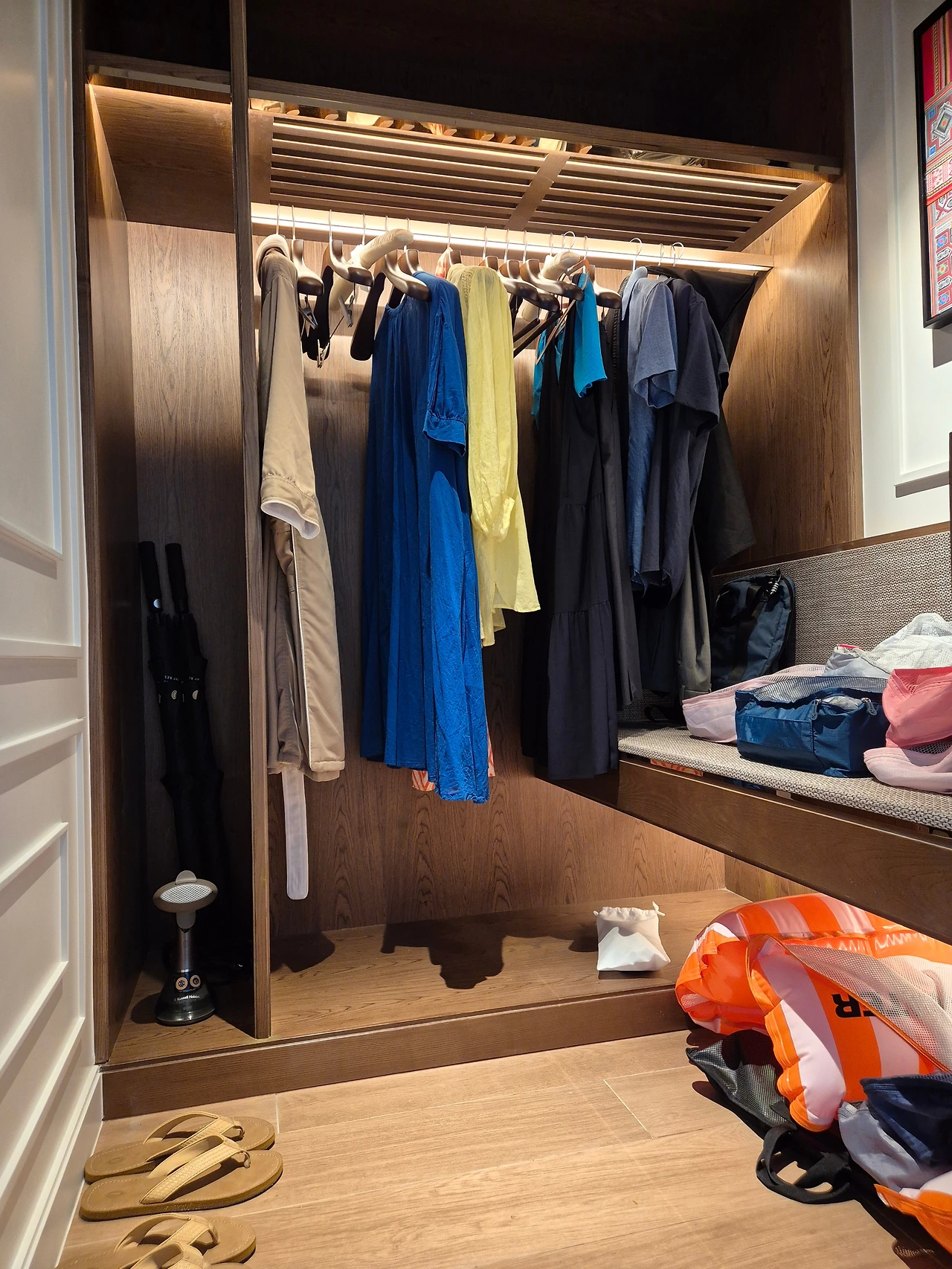 긴 드레스와 바지 걸기 편하고 캐리어를 펼쳐놓는 곳은 넓고 길어 여행 파우치들을 가지런히 놓을 수 있다.