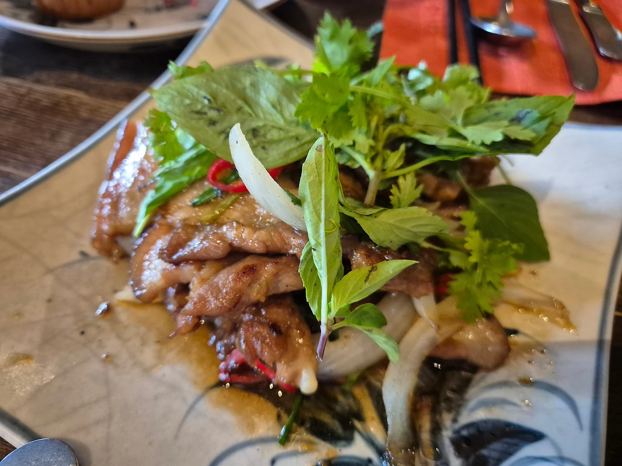 야채가 부실했지만 쌀국수에 넣는 푸릇 입사귀와 달걀 섹션에서 반숙 계란 후라이를 얹어