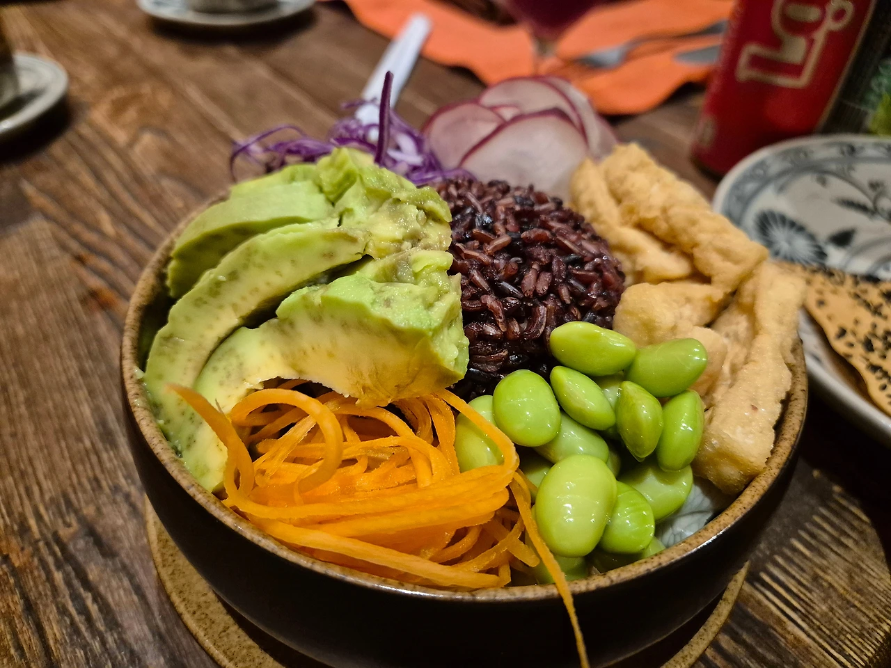 현미찰밥에 아보카도, 삶은 콩, 유부, 야채 토핑.