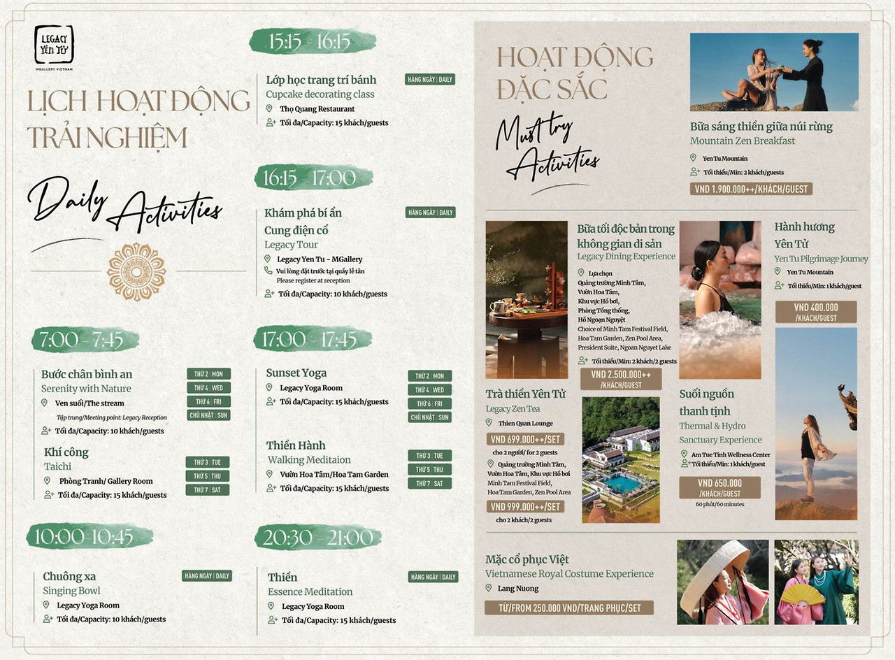 Yen Tu 산의 고대 유물에서 영감을 받아 모든 세부 사항에 세심한 디자인을 적용한 Legacy Yen Tu – MGallery는 베트남의 천년 역사에서 물려받은 정수입니다. 성역은 13세기 쩐 왕조 궁전의 건축물에서 영감을 받았으며 유명한 건축가 빌 벤슬리(Bill Bensley)가 전통적인 방식으로 생산된 수공예 가구와 재료를 사용하여 설계했습니다. 이곳에서 방문객들은 명상으로 가득 찬 평화롭고 오래된 공간에 쉽게 몰입할 수 있습니다. (옌뚜 호텔 공홈 소개글)