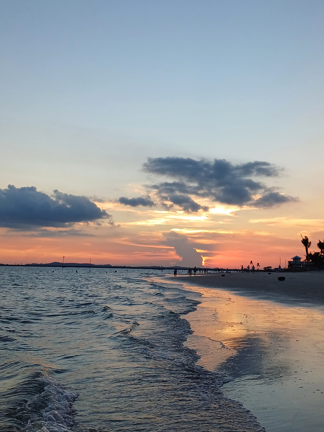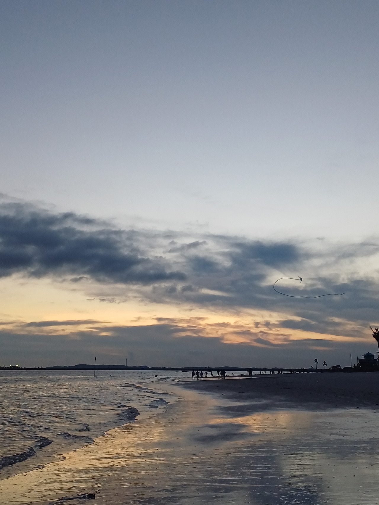 붉게 물드는 노을 아래 연을 날리는 사람, 러닝을 하는 사람, 조개를 줍는 사람