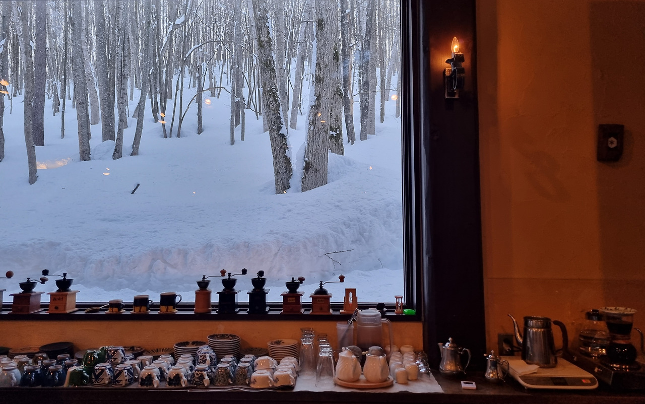 혼자 온 데다 사람도 많지 않아 바테이블로 안내된다. 앉고 싶던 자리다. 비스듬히 경사진 산에 쌓인 흰 눈이 큰 창 너머로 쏟아져 들어올 것만 같다. 그 앞에 앉아 핸드밀 그라인더로 커피콩을 직접 갈아내니 고소한 커피 향이 내게로 스민다. 오늘은 바삐 가지 않아도 되니 천천히, 온전히 음미한다. 바 테이블 너머 친절한 직원이 다 갈린 커피가루를 간결하고 정성스럽게 내 눈앞에서 융드립 해준다. 작은 돈 주고받는 귀한 대접. 귀한 풍경이다. 커피는 찻잔 맛으로 먹는 내게 덧붙여 따라오는 다정하고 소중한 순간이다. 그리고 이곳에서도 호사스러운 책 읽기는 계속된다.
