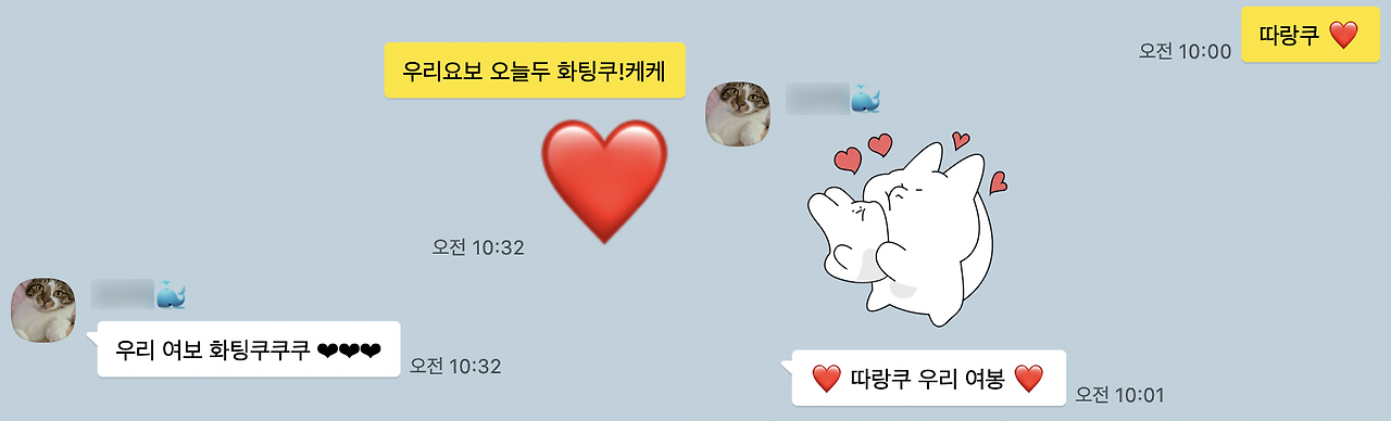 우리 부부는 싸울 때는 마치 서로를 죽일 듯 치열하게 싸우지만, 그렇게 싸우고도 잘 화해만 하면 바로 다시 잉꼬부부로 변신을 한다. 결혼 4년 차인 지금까지도 아직까지 자기 전 뽀뽀와 포옹은 물론이고, 매 카톡 메시지마다 하트를 붙이며, 대화가 마무리될 때는 사랑한다는 말로 마무리하고 있다.