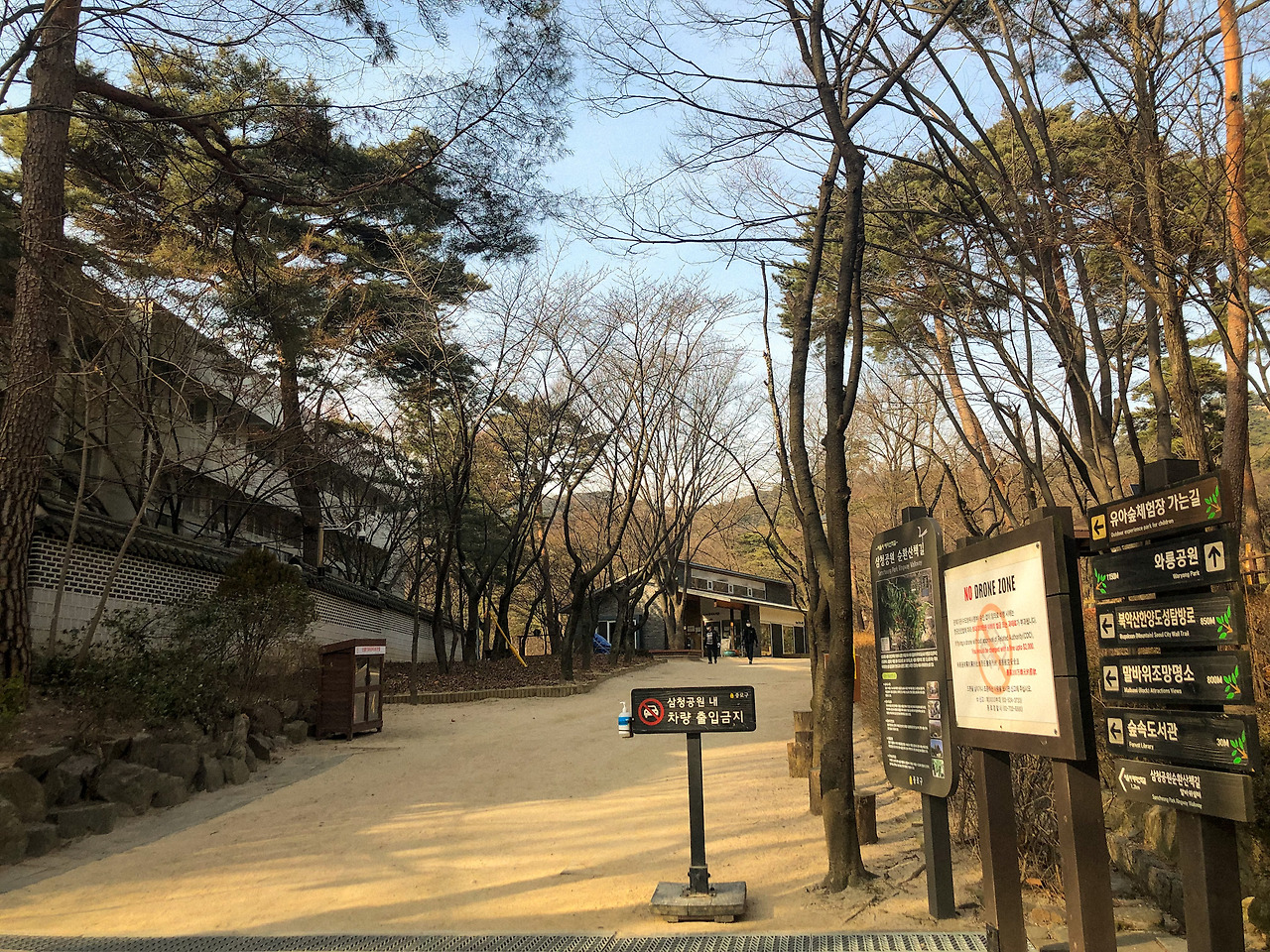 마을버스로 언덕을 오른 후 가파른 내리막길을 걸어서 삼청 공원에 도착했다. 삼청 공원 입구에서는 새소리가 들렸다. 삼청 공원 입구에서 왼쪽을 보면 삼청 숲 속 도서관이 있다.