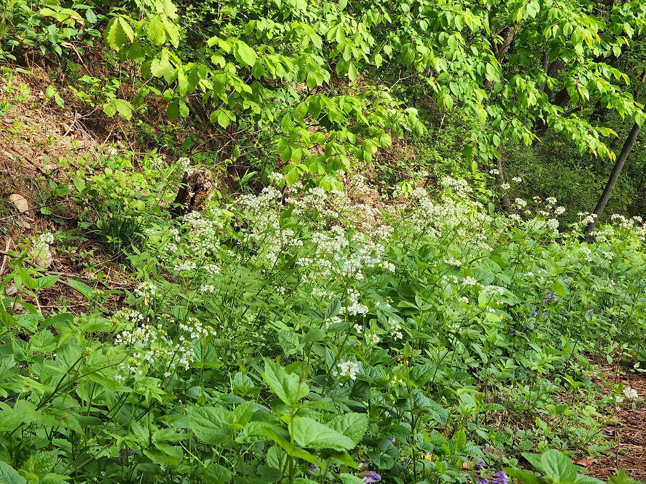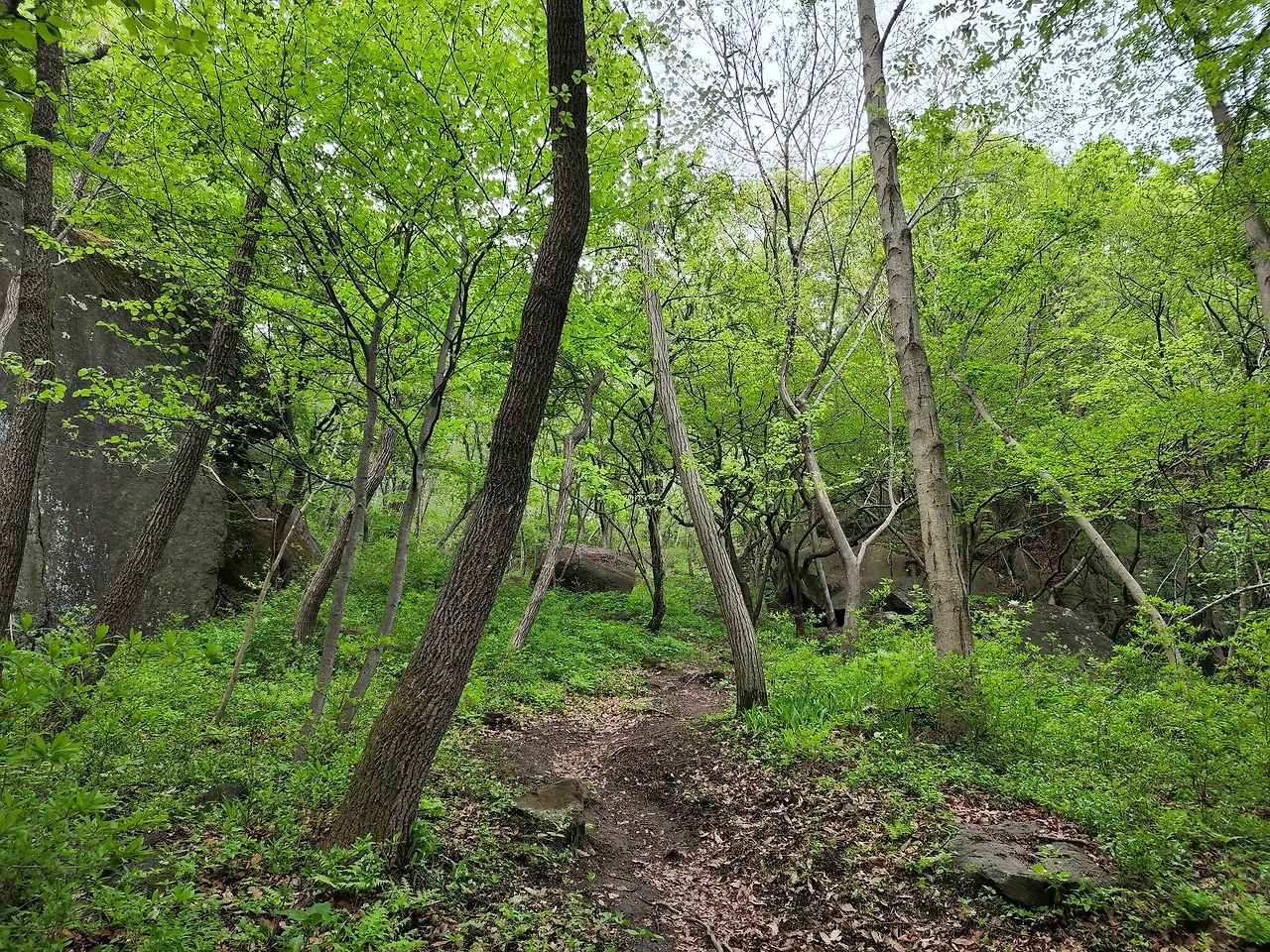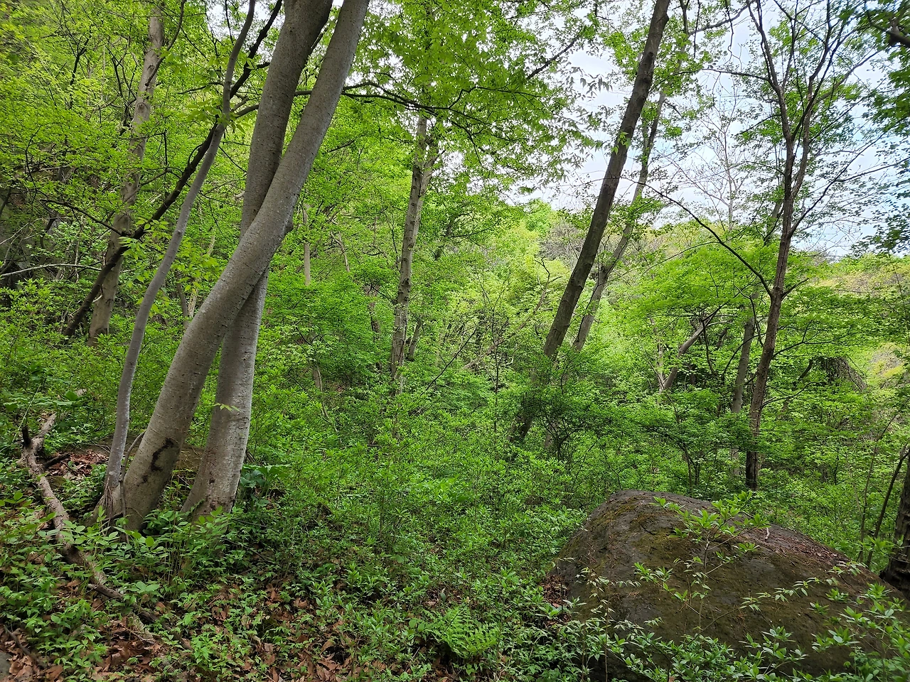 초 5월의 도비산은 다시 태어난 듯했다. 갓 나온 새 이파리의 여리여리하고 청명한 초록색이 산을 가득 채웠다. 깨끗하고 싱그러운 새 잎이었다. 등산을 자주 하지도 않았고 잎에 관심을 기울이지도 않아서 이런 이파리 색은 처음 보는 듯했다. 몇십 년을 제자리에서 견딘 나무들이 내보내는 새 이파리는 맑은 색을 냈다.