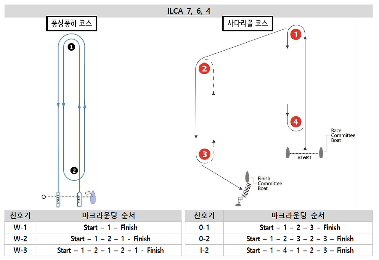 * 사다리꼴 코스는 마크가 4개, 풍상풍하 코스는 마크가 2개가 있고 매 경기운영정의 안내기에 따라 마크 도는 순서와 횟수가 정해진다.