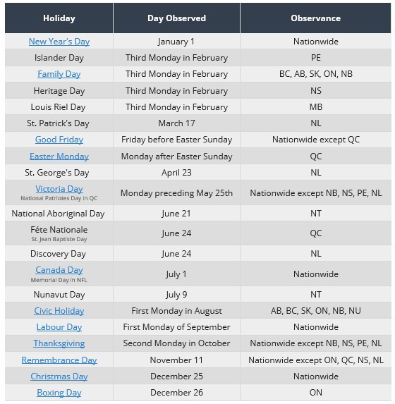 캐나다의 공휴일(이미지 출처 www.statutoryholidays.com)
