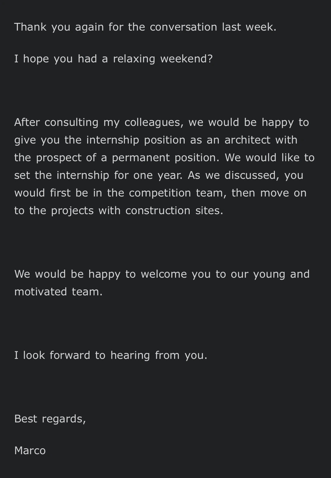 오빠의 취리히 합격소식 후 처음으로 보내본 스위스 취리히근방 아르가우 주(취리히에 있는 사무실인 줄 알고 이력서를 보냈는데)에 있는 한 회사에서 인터뷰를 보자는 연락이 왔다. 포트폴리오를 보낸 지 이틀 만에 연락이 왔고 그다음 주에 바로 화상 면접을 봤다. 간단한 소개와 함께 스몰톡을 나누고, 내 포트폴리오를 소개했다. 약 한 시간 정도 인터뷰를 진행 후 그쪽 회사에 대한 소개와 프로젝트 소개 그리고 팀원들까지 다양한 이야기를 주고받았다. 일 년에 5주의 휴가와 유연한 근로제 그리고 인턴이지만, 한국보다 많은 시급과 자유를 누릴 수 있을 거 같아 벌써부터 신이 났다. 나름 좋은 텐션과 분위기로 합격을 장담했다. 그리고 며칠 후 합격의 기쁨을 누릴 수 있었다.