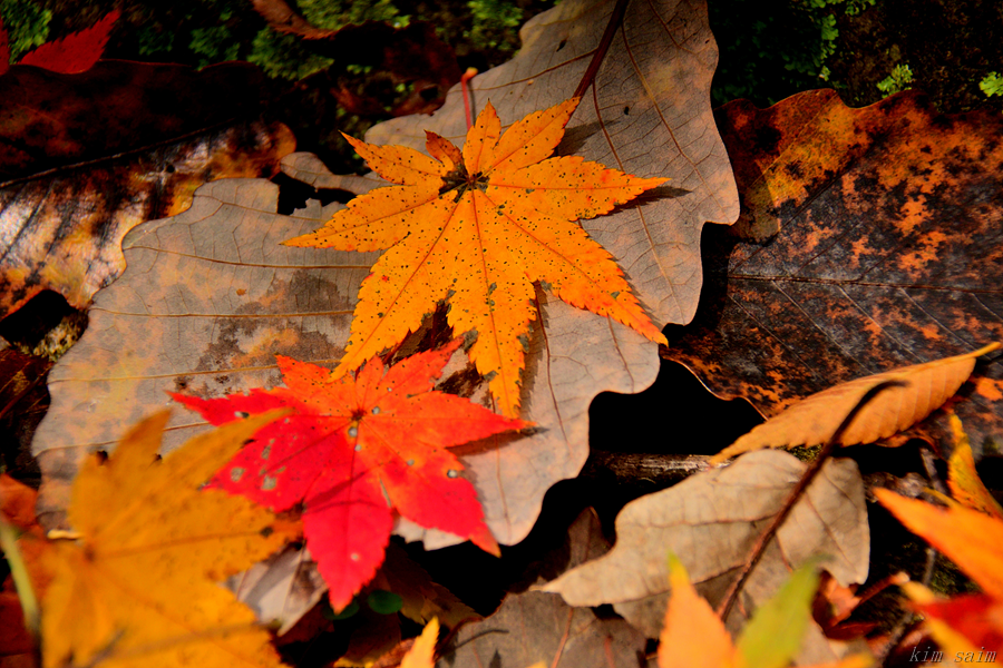낙엽 위에 곱게 내려앉은 단풍잎 곁에서