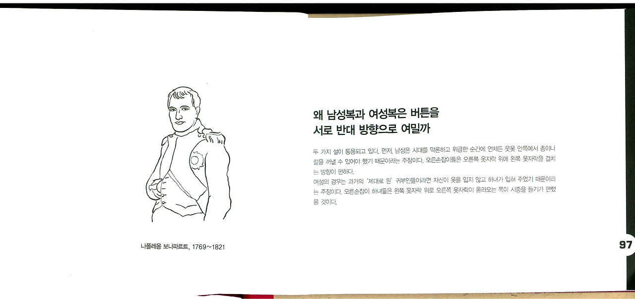 오른쪽에, "왜 남성복과 여성복은 버튼을 서로 반대 방향으로 여밀까" 타이틀과 내용 설명.