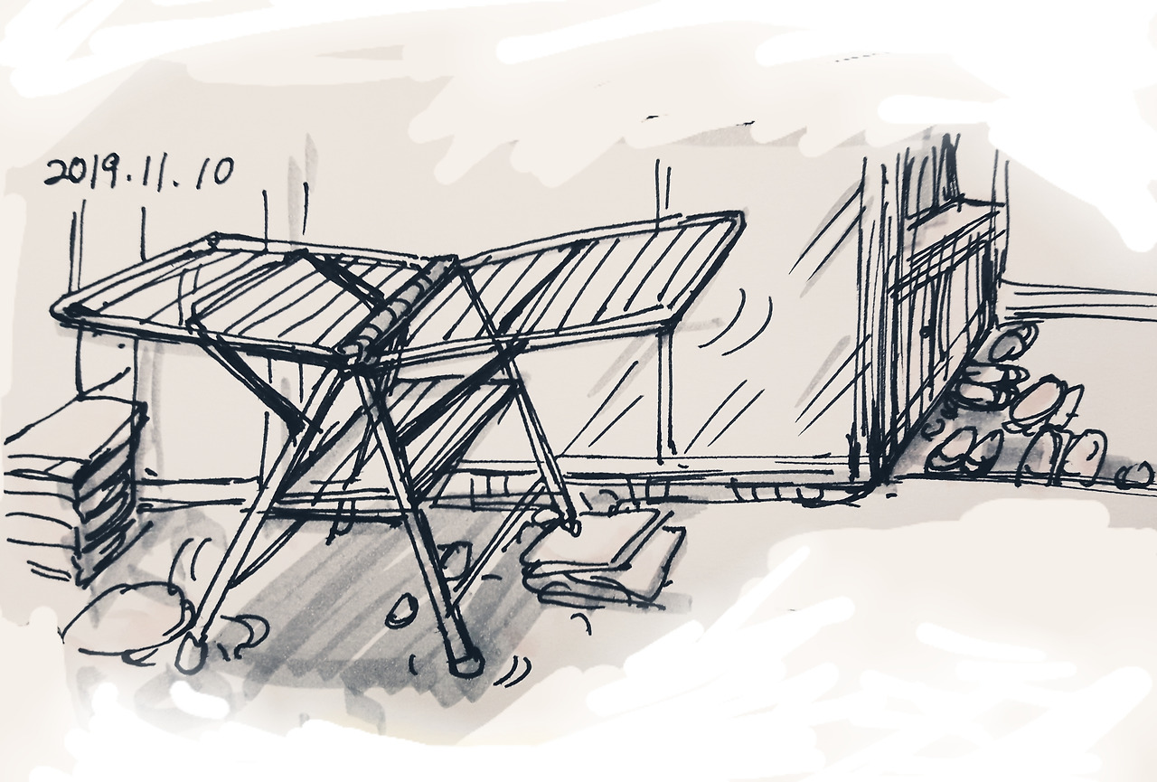 거실을 차지한 삼단 행거는 18평 살림집에 턱없는 덩치였다.