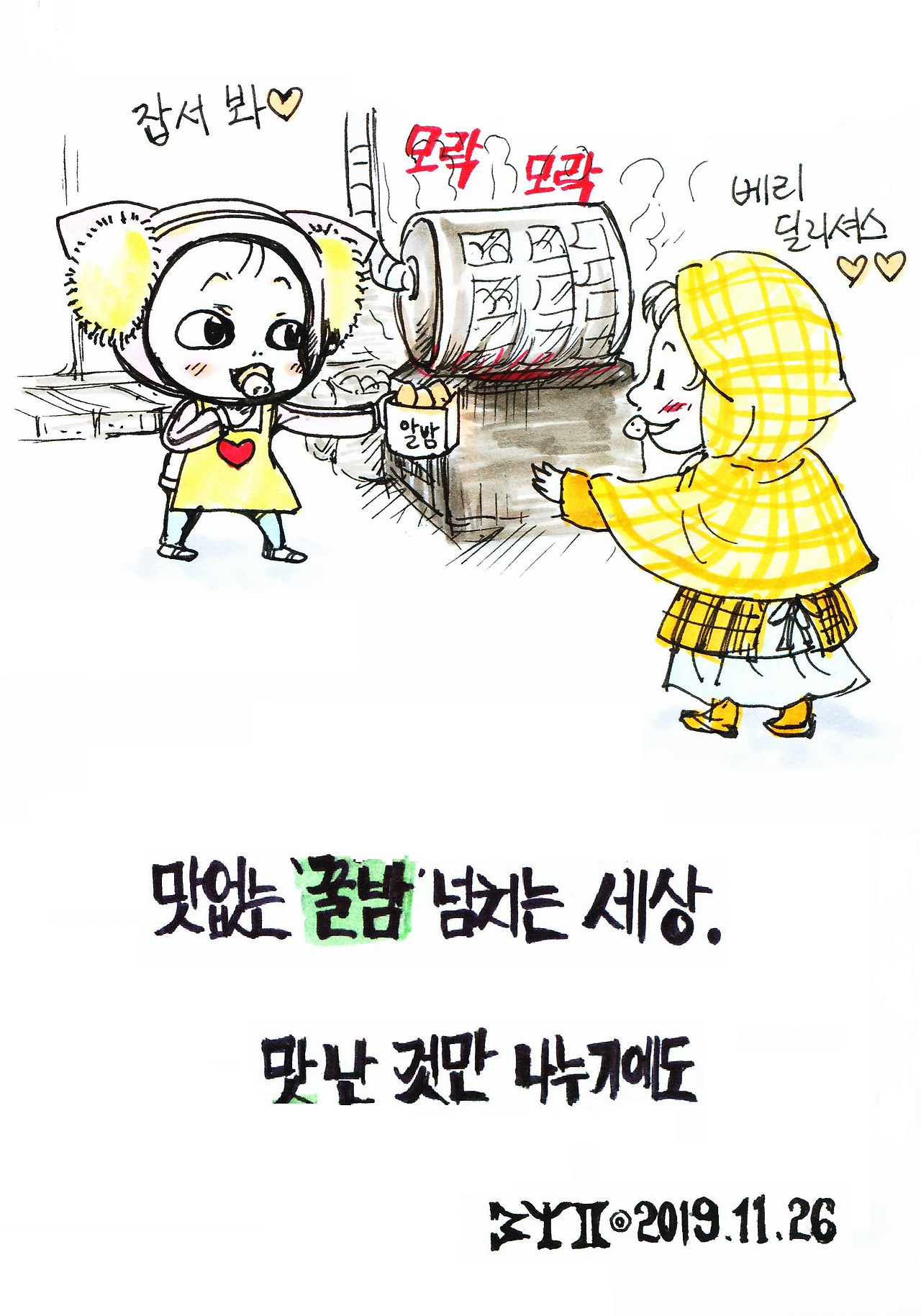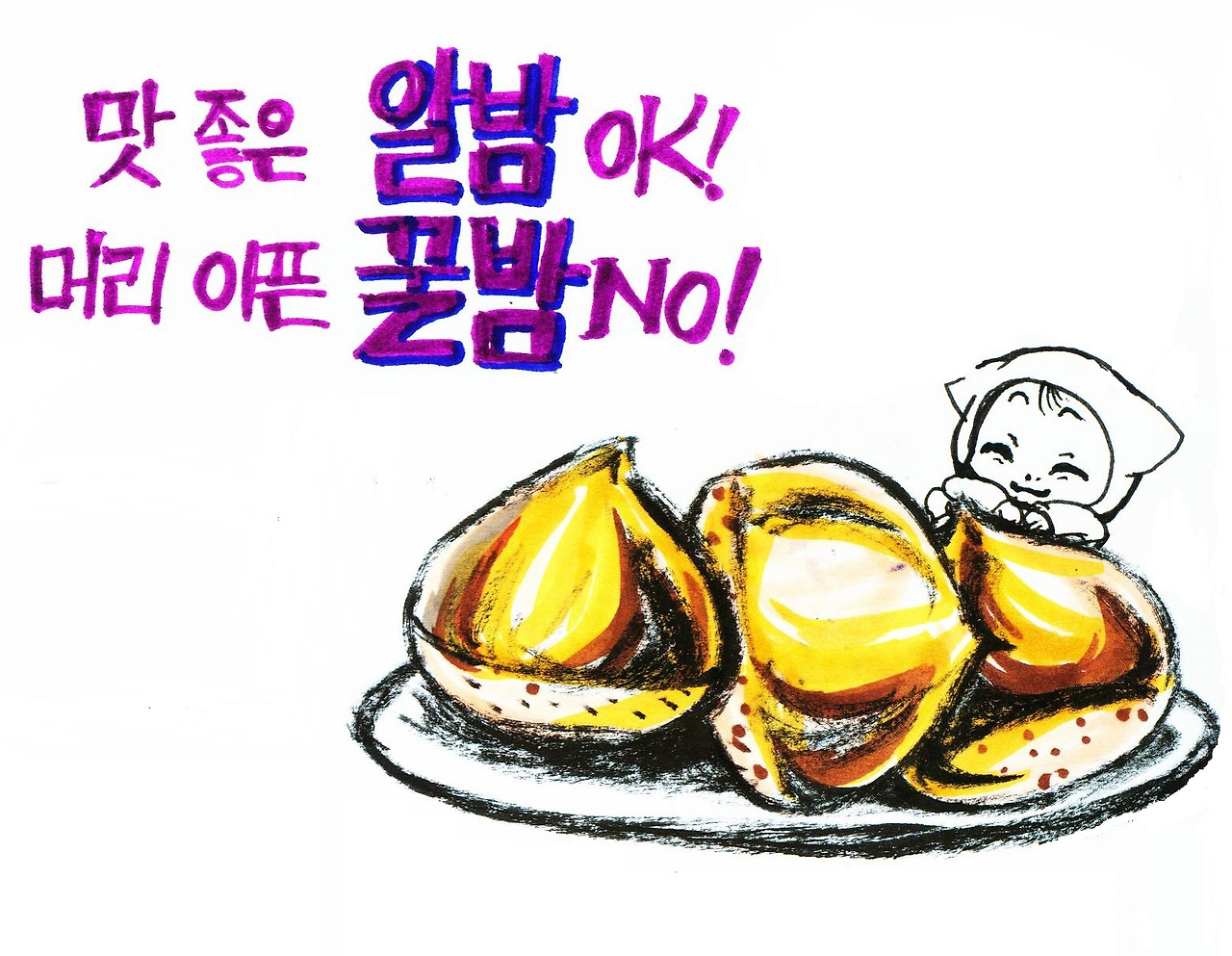 "모락모락 알밤이 왔어요, 알밤~"
