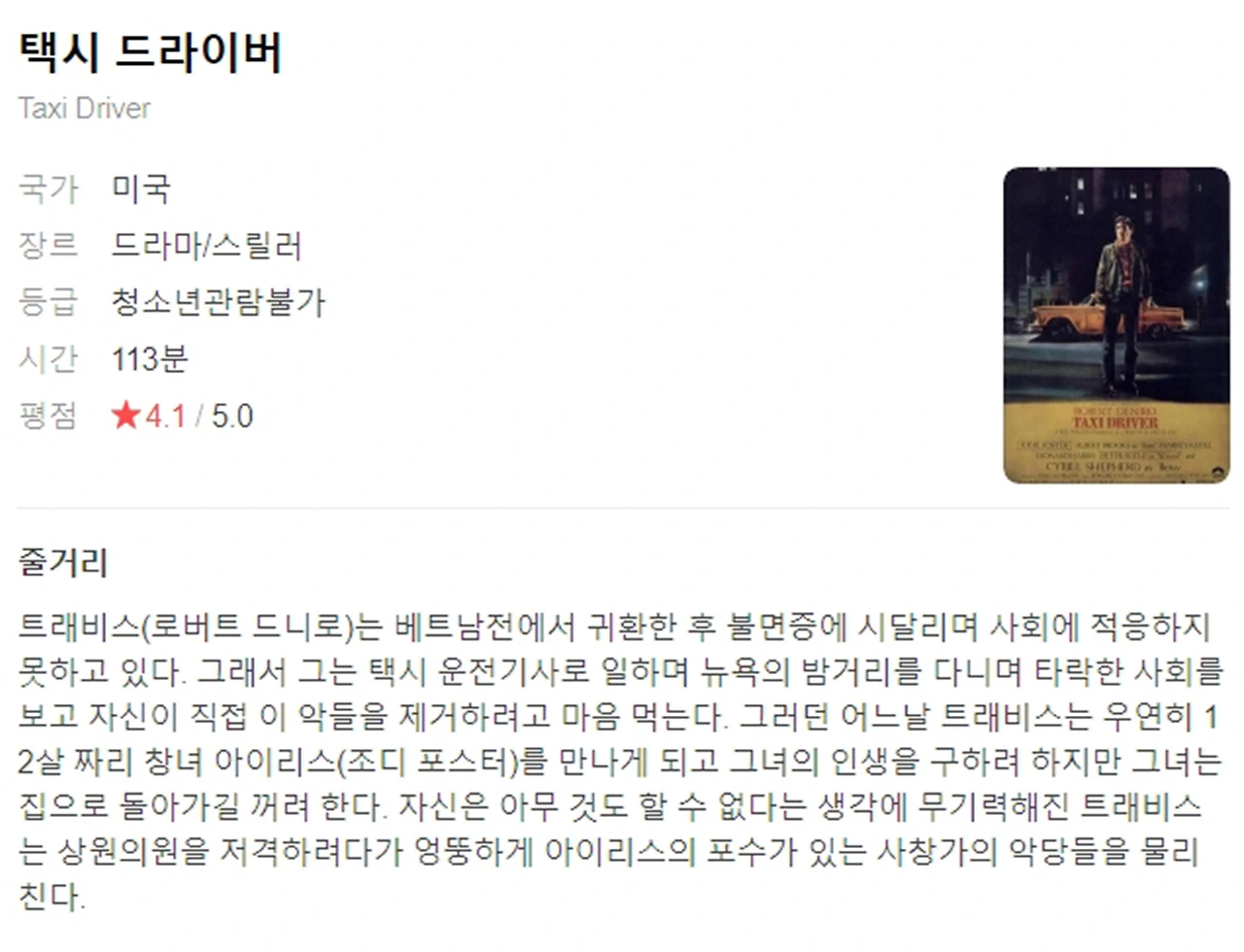 앞서 로버트 드니로 연설을 소개하였으니 로버트드니로 주연, 마틴스콜세이지 감독의 <택시드라이버>를 추천한다.
