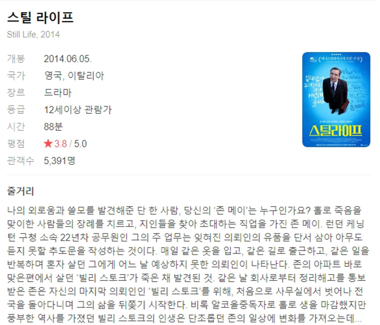 나만 제자리라고 느끼는 경진일주에게는 유베르토 파솔리니 감독의 <스틸라이프>를 추천하며 마친다.