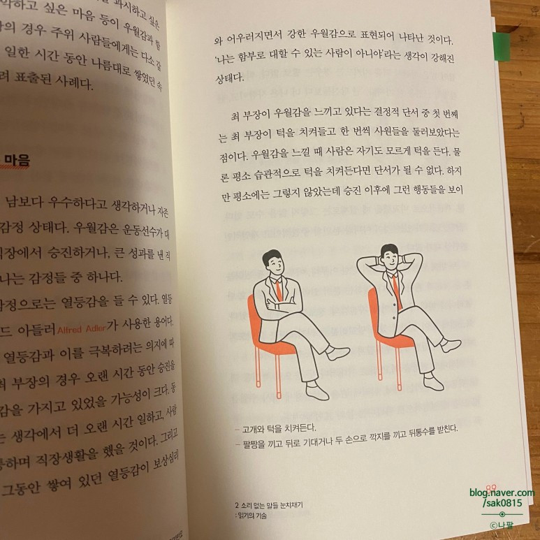 둘째, 상대방의 마음을 정확히 있는 것이 중요하다고 말한다. 그러기 위해서는 소리없는 말들인 표현이나 행동들을 잘 관찰하고 그것이 상대방의 어떤 감정을 나타내는 신호인지 파악하라고 이야기 한다. 이 책에서는 화, 불안, 두려움, 슬픔, 우월감, 경멸, 혐오, 행복의 감정들을 알아챌 수 있는 표정과 몸짓의 단서들에 대해서 이야기 하고 있다. 그 이야기를 풀어내는 과정에서 직장내에서 경험할 수 있는 상황의 예시를 재미있게 설명함과 동시에 그 감정들을 나타내는 표정과 행동을 그림을 통해 나타내어 이해하기가 매우 수월하다.