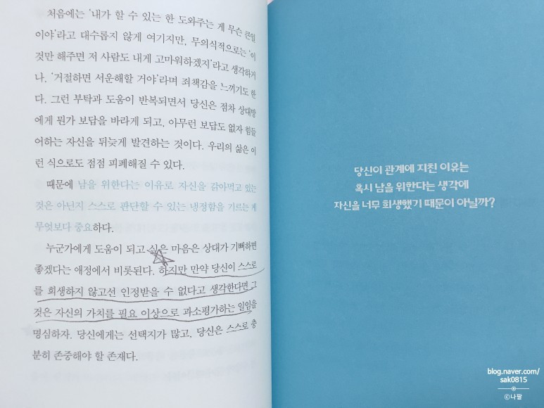 잘 생각해보면, 내가 양보한다고 해서 남들이 꼭 행복해지는 것도 아니라는 것을 이 책은 말하고 있다.