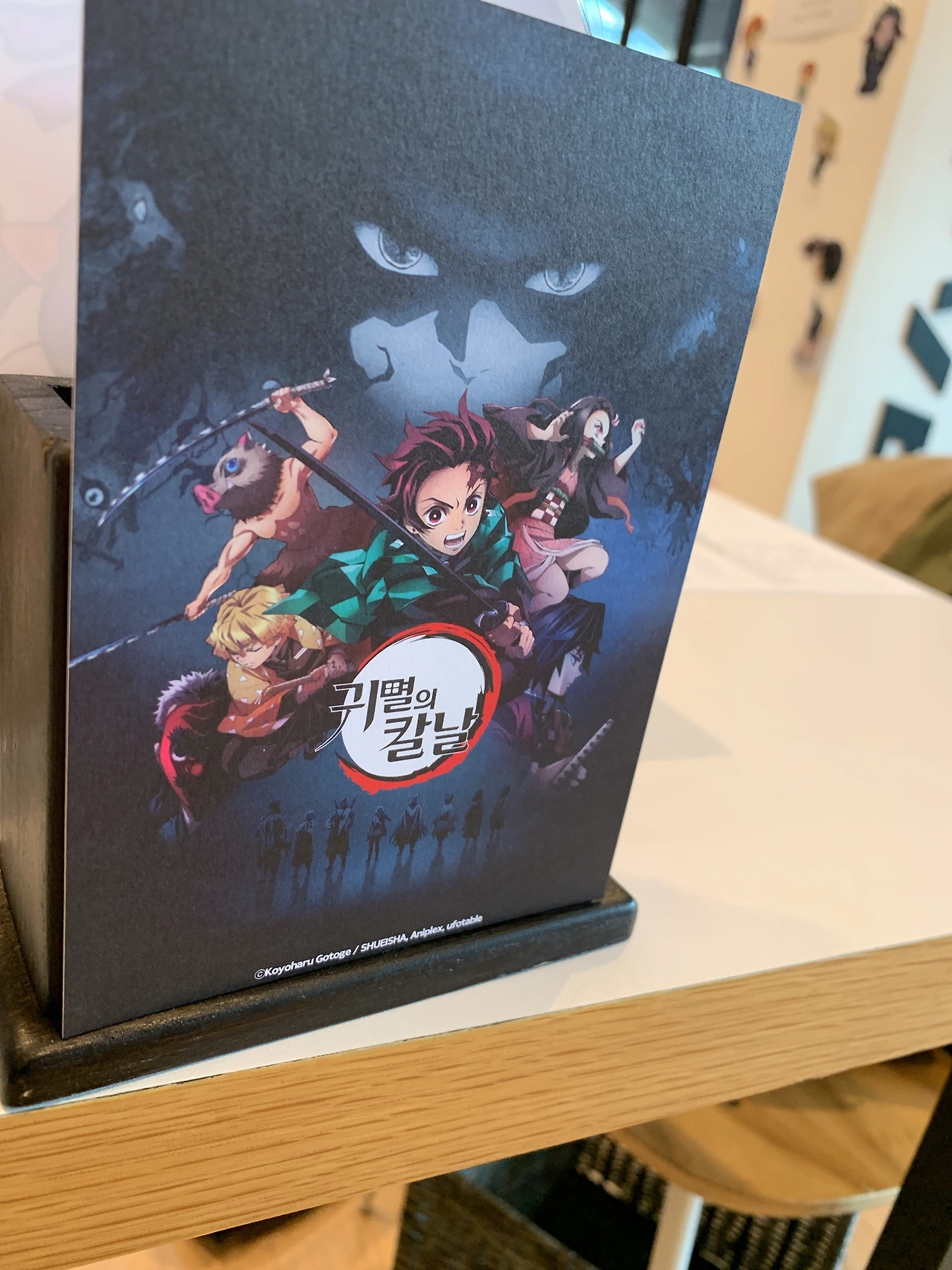 또 다른 쪽에는 이 두 애니의 관련 굿즈와 한국지점을 축하해주는 원작자들의 캐릭터 담긴 직필 사인 색지와 원서 자료들이 놓여 있었다.