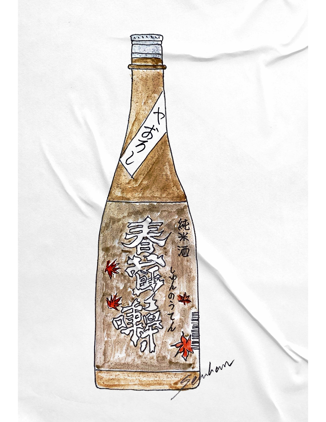 병 디자인만 보면 봄 춘(春)이라는 글자와 가을 단풍이 오묘하게 표현되어 어울리지 않는 디자인이다. 생각해 보면 중간띠에 히야오로시(봄에 병입 하여 가을에 출하하는 술)라고 적혀 있어서 봄과 가을이 공존하지 않았나라는 생각이 든다. 그래도 정확한 어원을 파악하기 위해 찾아보니 슌노우텐은 중국 당나라 시대에 만들어진 전통음악의 악곡명으로 꾀꼬리 목소리를 본떠 작곡되었다는 설이 있단다. 왠지 억지스러운 네이밍이지 않나 싶기도 하다.