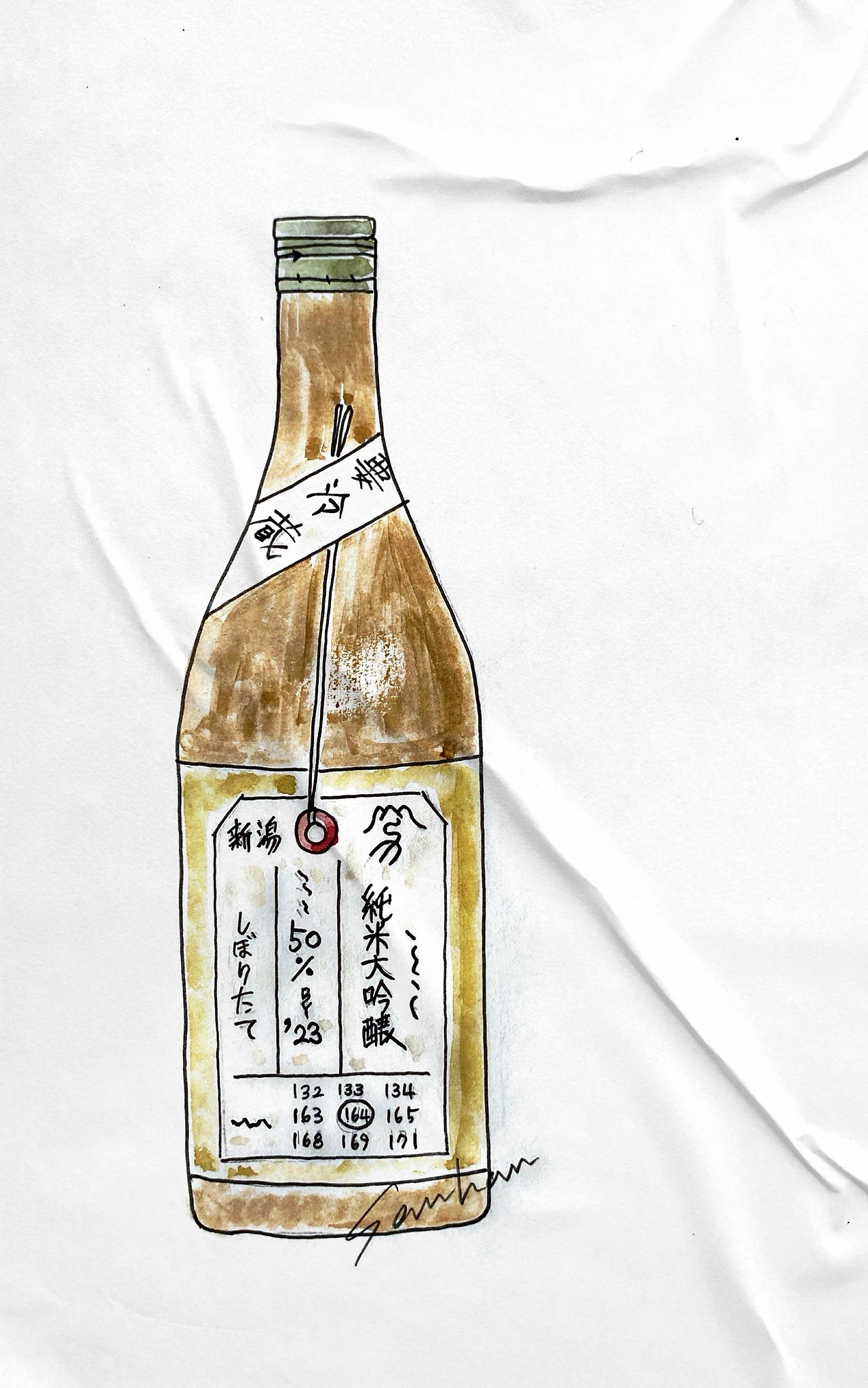 독특한 라벨로 유명! 옷에 붙어 있는 상표 태그나 화물에나 붙일법한 화찰 라벨이 눈을 사로잡는다. 브랜드는 아주 작게, 술 정보는 크게!! 아래 숫자(164)는 술 탱크 번호인데 어떤 탱크에서 병입 되었는지 표시하는 거다. 네이밍은 니이가타현의 카모지역에서 생산한 비단(錦)이라고 하여 카모니시키! 개인적으로 좋아하는 술이고 지인에게 선물해도 좋은 사케다.